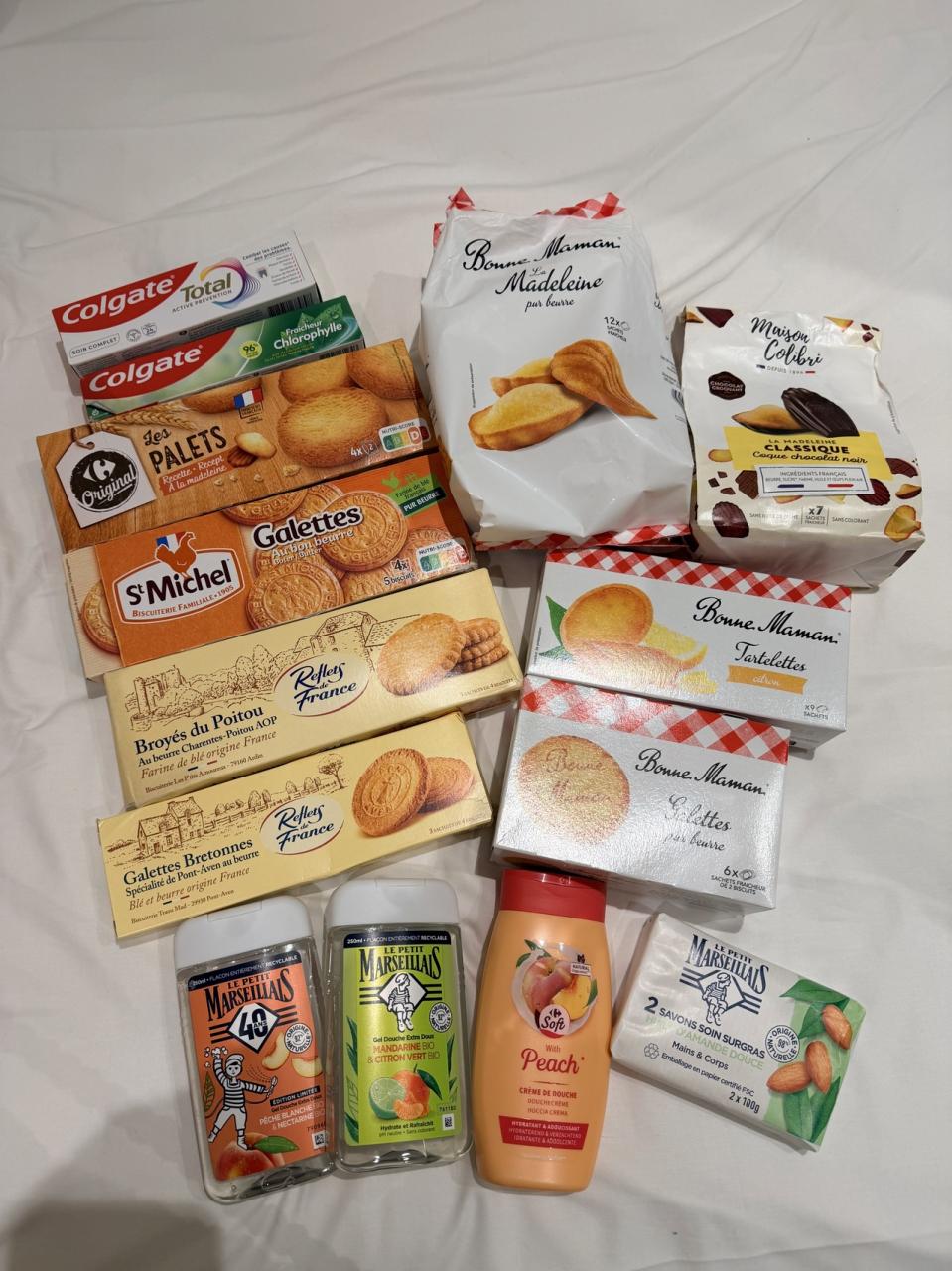 スーパーの購入品。友人がクッキー好きだから多めに。ボンヌママンのマドレーヌとメゾン・コリブリのチョコのかかったマドレーヌおいしかった!友人からはボンヌママンのサブレとシトロンのタルトも好評でした♪