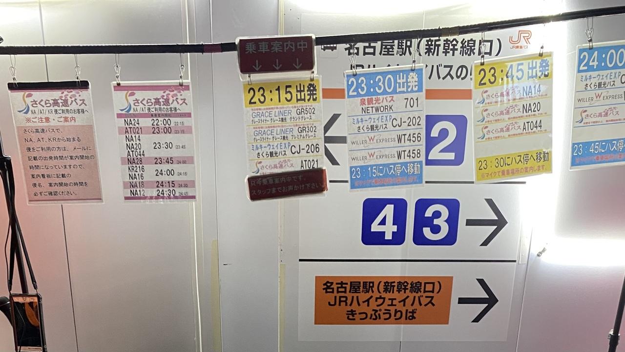 PM23:30と予約サイトに書いてあったので出発時間だと思ってましたがその時間は案内の時間で出発はPM23:45でした。案内が遅くビビってしまいました。名古屋駅はいつまでやるのかリニア工事で、新宿のバスタみたいなバスターミナル作って欲しいですね。