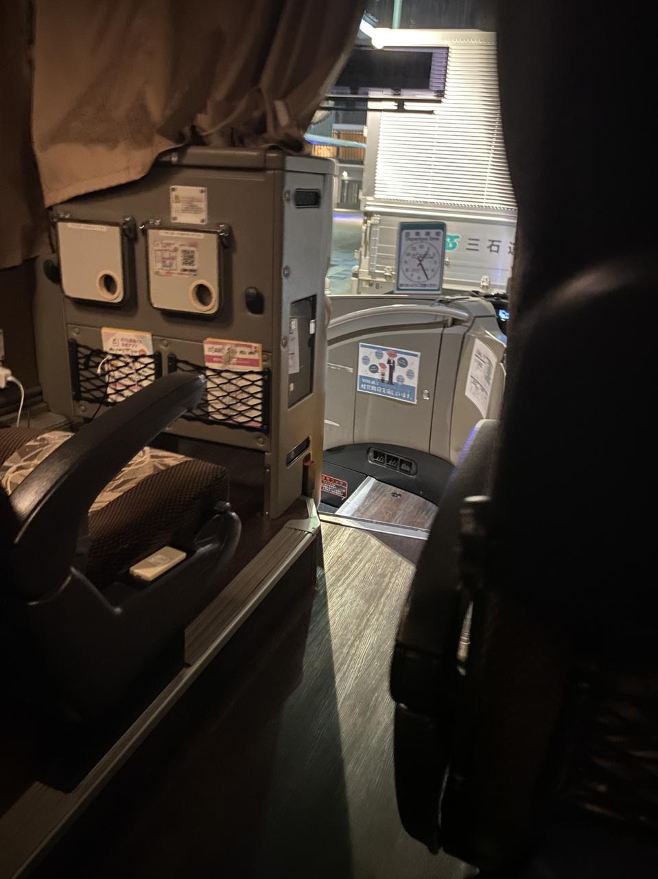 鉄道系バス会社と違い、到着すると急に照明が付き前方のカーテンが開き、特に休憩先のアナウンスはなく、初めは降りていいのかわからなかったです。