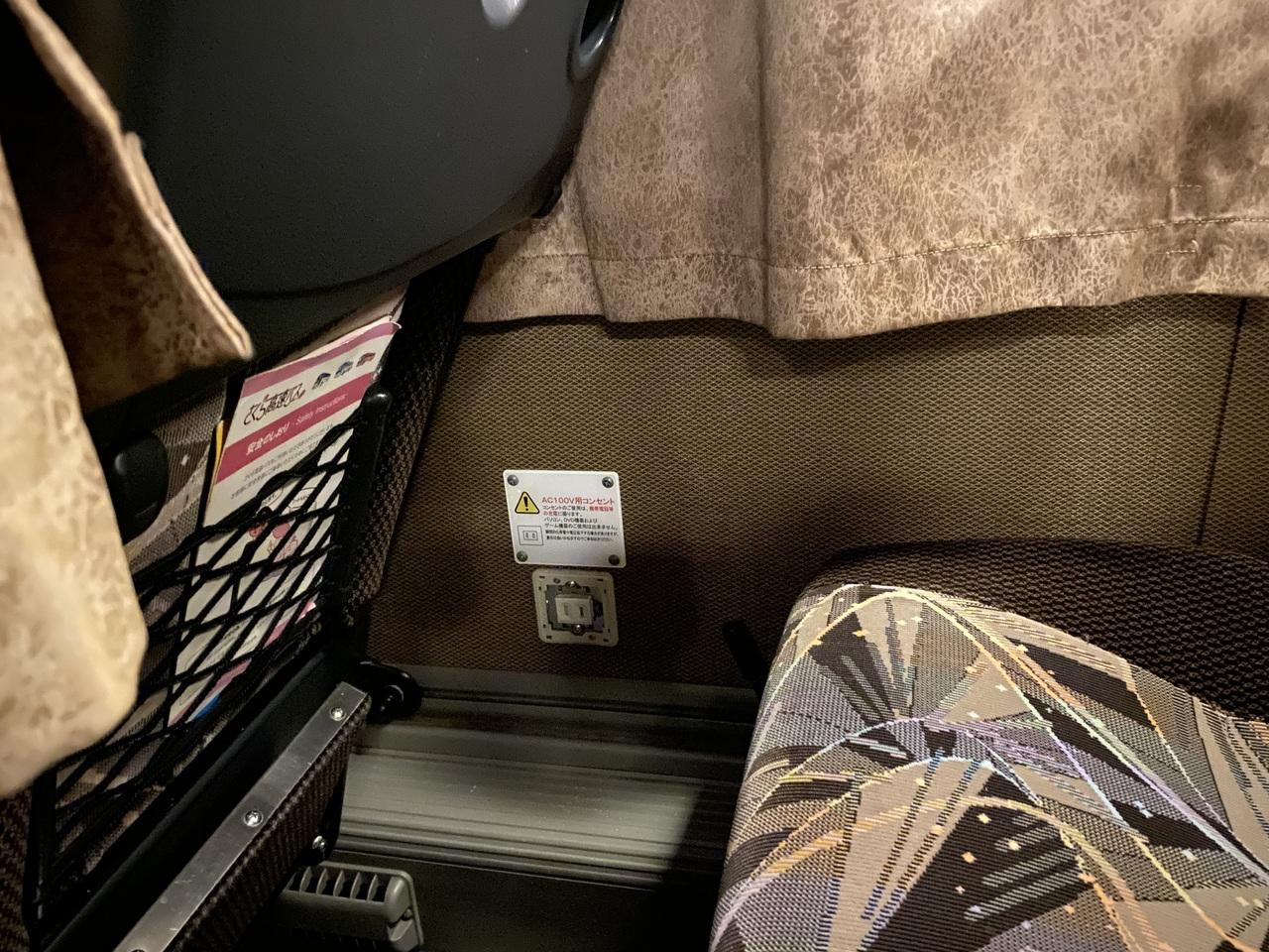 窓側は壁にコンセント。足置きもありますが、足を伸ばすなら使わない方がいいです。鉄道系バス会社と違い、運転手からかなりの長めのバスの案内がありました。些細なクレームが多いんですかね?
