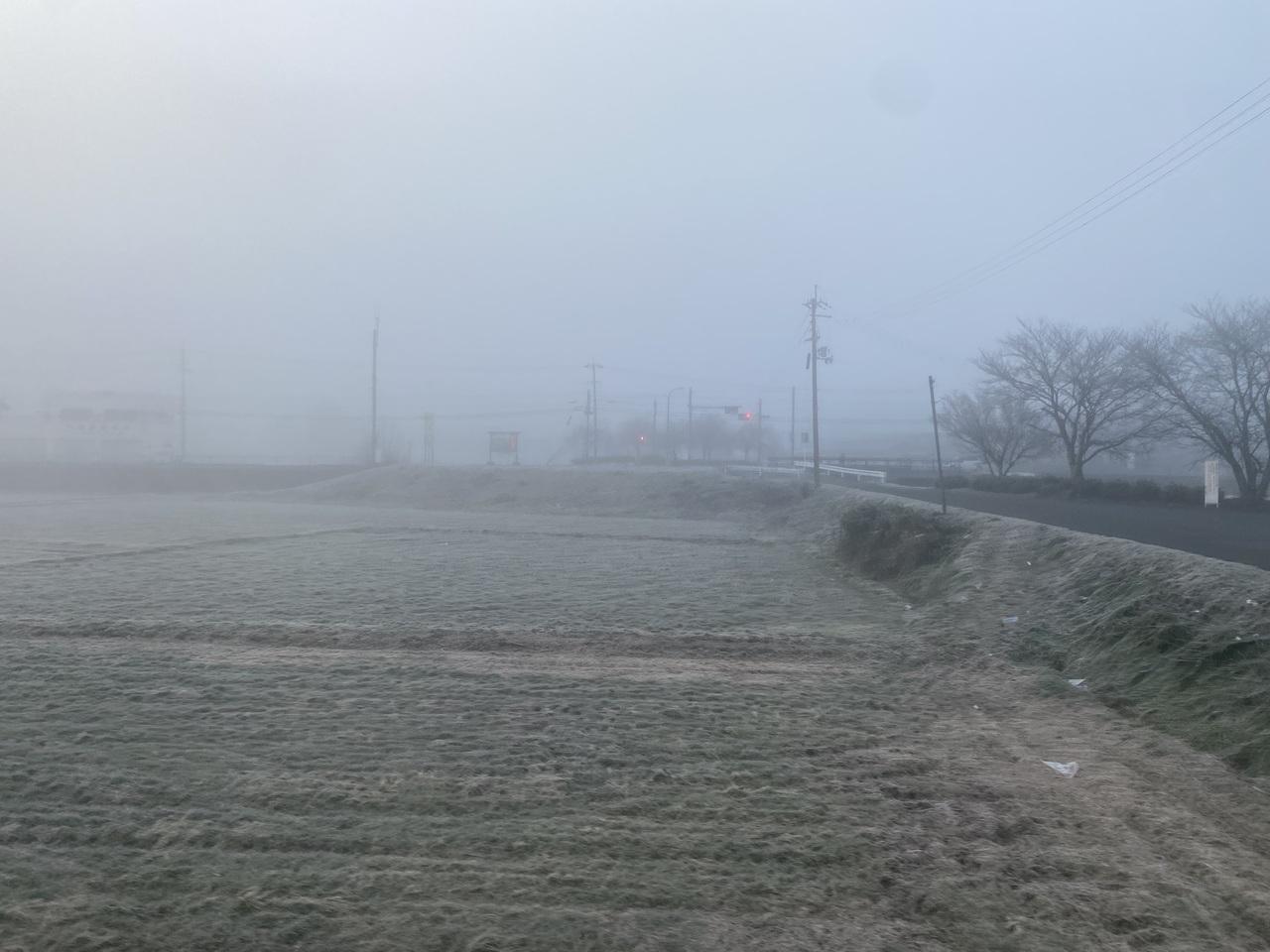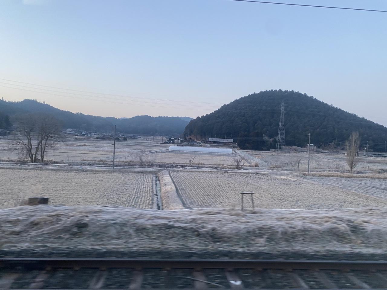 霜が降りた車窓。車内でも寒さを感じます。