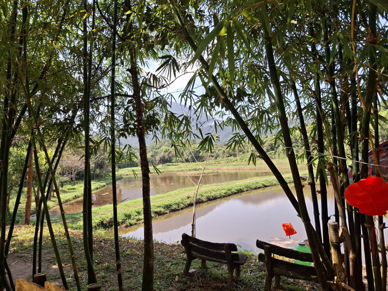 手前にちょっとしたお店、その向こうに水田でしょうか?池でしょうか?