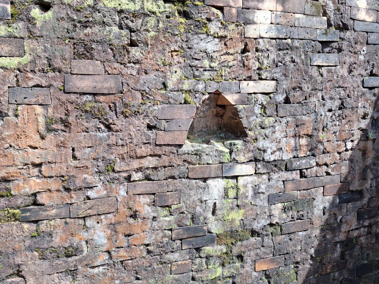 新しいレンガの積み上げ。手前の黒い部分はオリジナルらしい