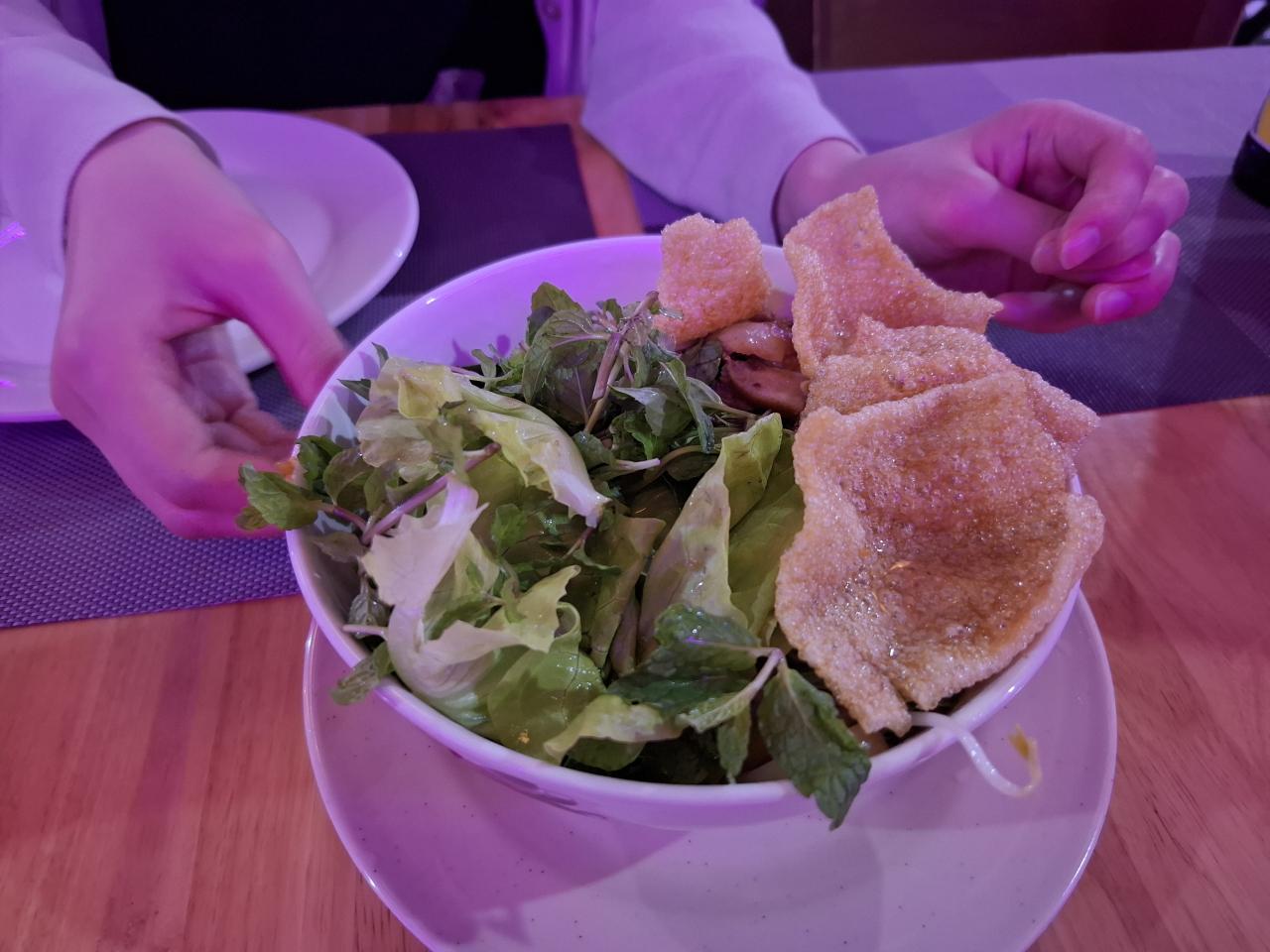 カウライ。少し硬めの色付き麺。たれと混ぜて香草といただく。