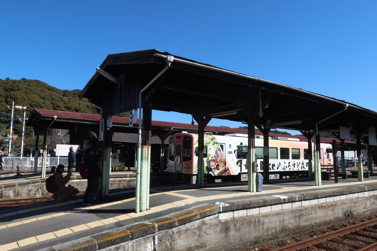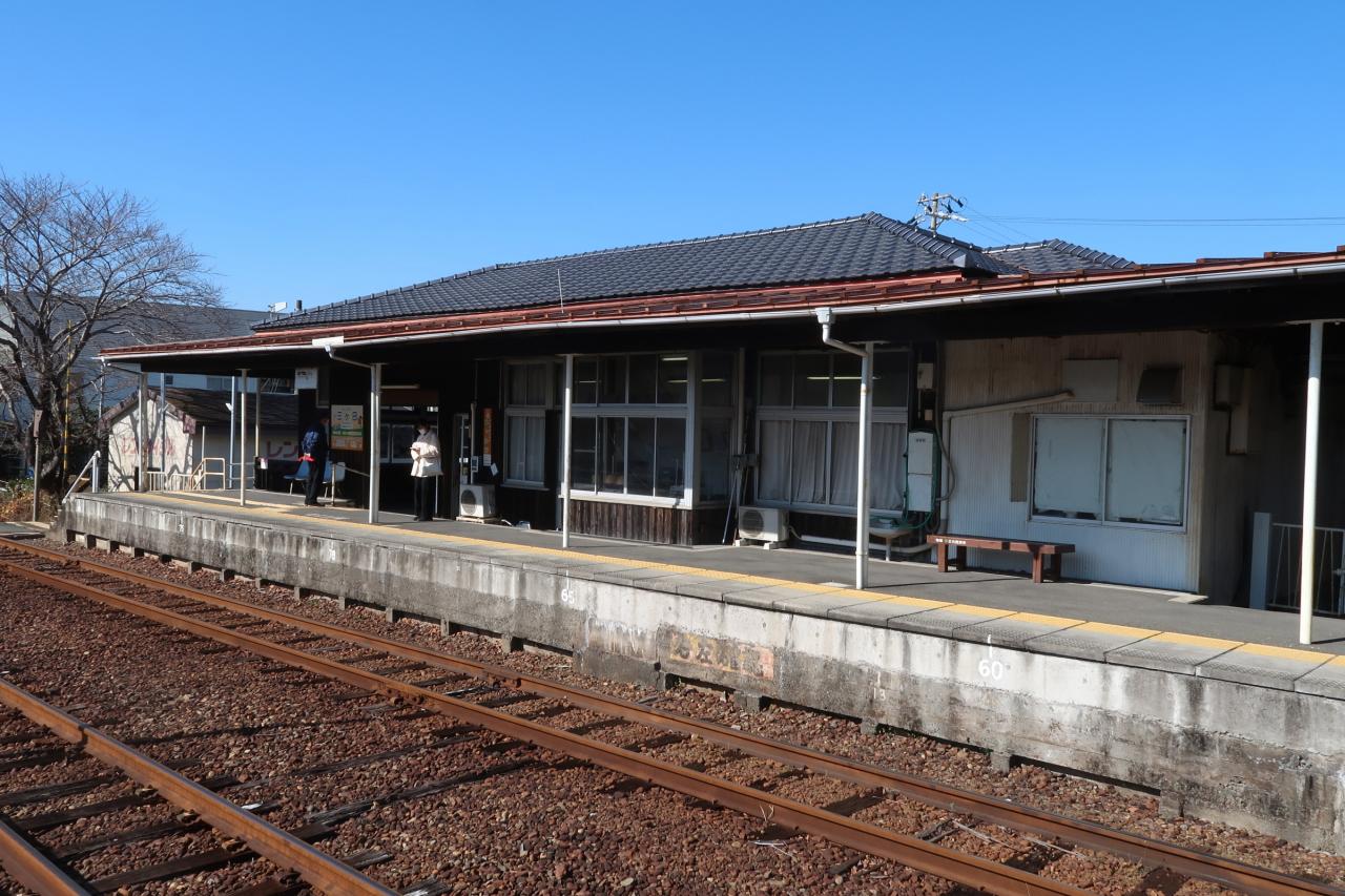 この駅舎は、昭和15年(1940年)に改築された木造駅舎を耐震化工事のために一時解体し、2014年に元の姿に復元したもの。 -