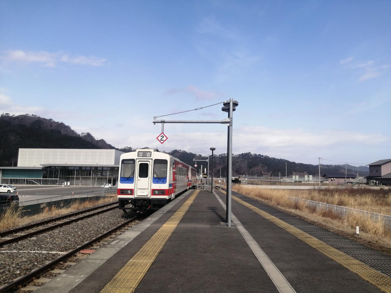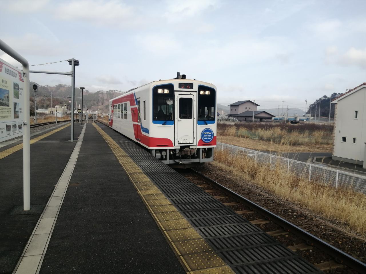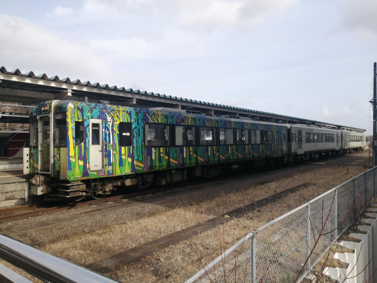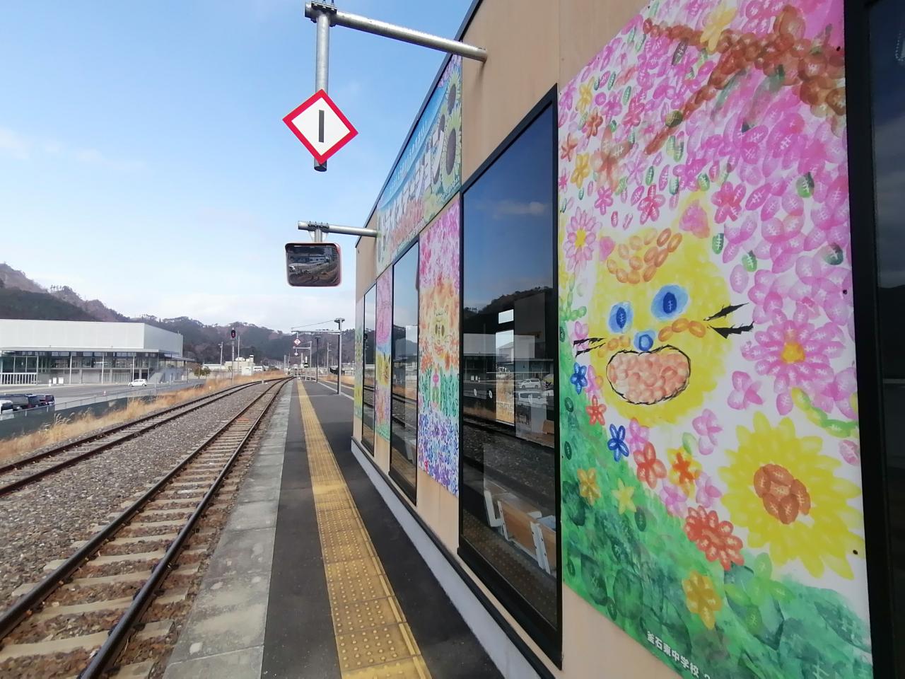 改札を入ってホームに行きました。遠くに三陸鉄道の盛駅行きの電車が見えました。「とうぎん×キキ&ララ」のラッピング電車でした。 -