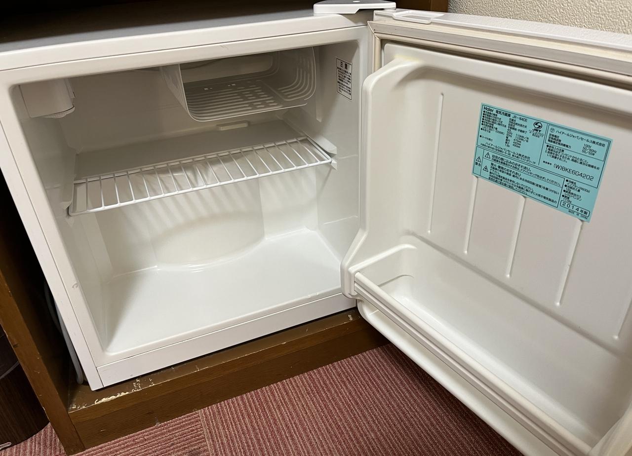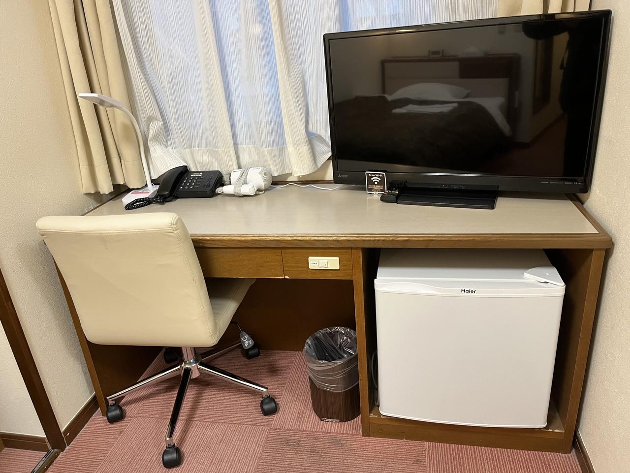 入って奥に横長の机。道路に面してます。テレビと、ドライヤー、電話、電気スタンド。テレビの下にはスイッチを入れて使う、冷蔵庫。ゴミ箱、椅子。 -