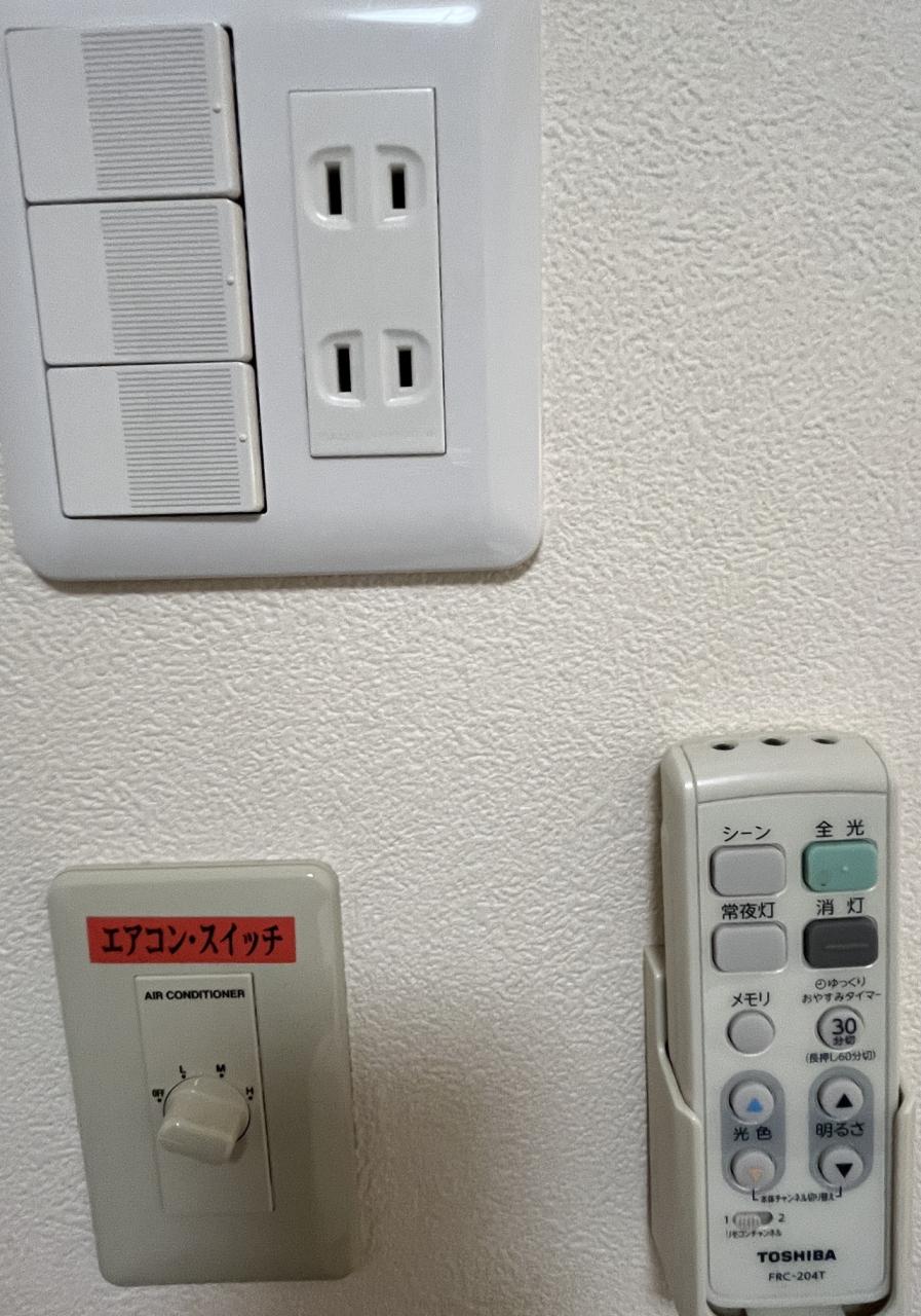 ベット上のコンセントとスイッチ。エアコンは集中管理。常に19度程度あったので、暖房は付けませんでした。