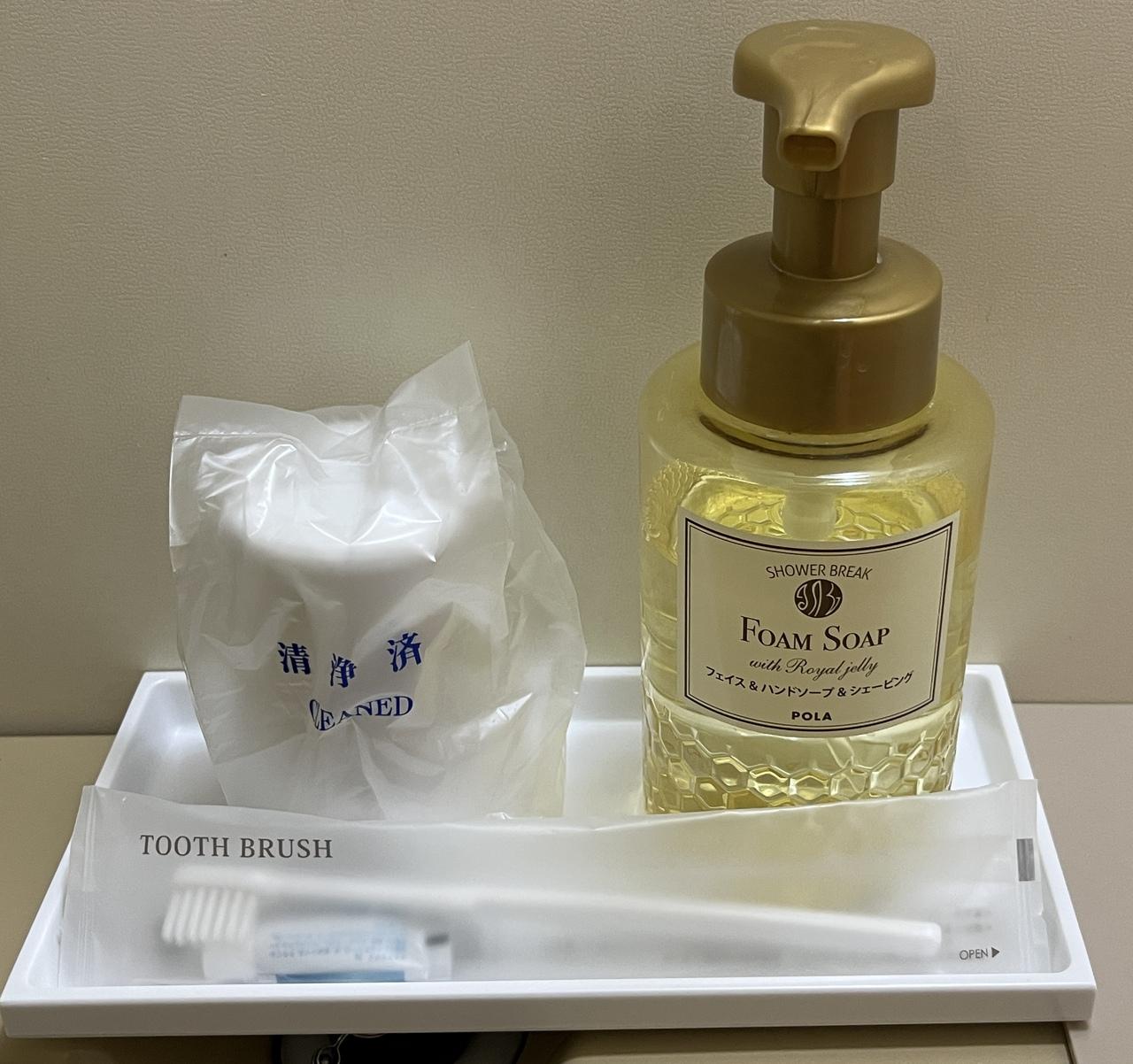 歯ブラシはお部屋にありました。フェイスハンドソープもポーラ製。