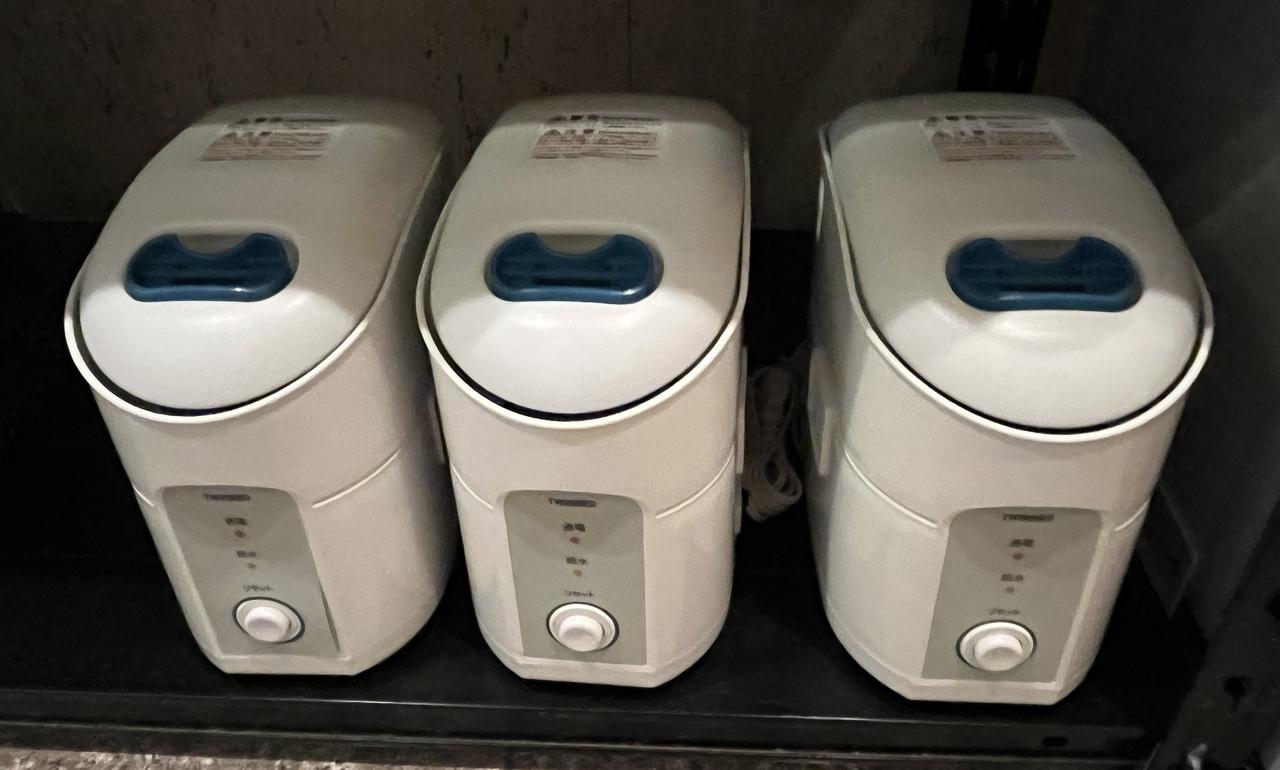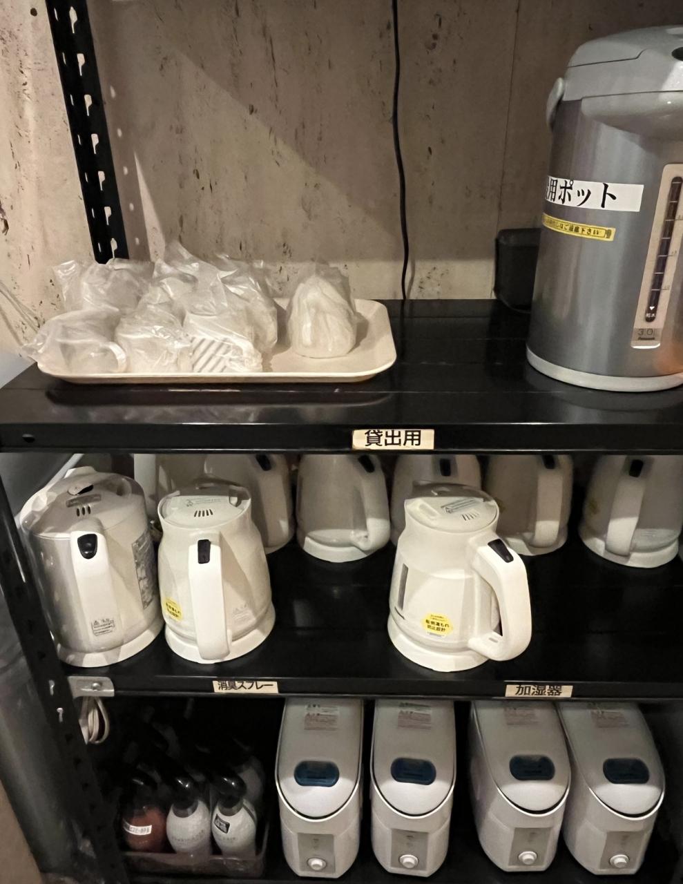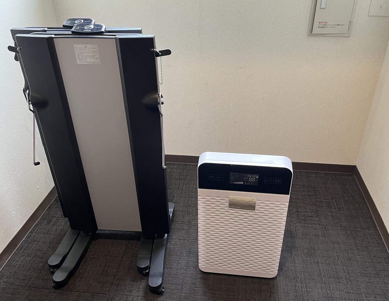 部屋の左側の廊下には、空気清浄機とズボンプレッサー。必要な方はご自分でどうぞ。真っ先に空気清浄機を1台お部屋に。私が見た時には2台しかなかったけれど、朝見ると、この状態でした。花粉症の時期なのに、皆さんお使いにならないのね。