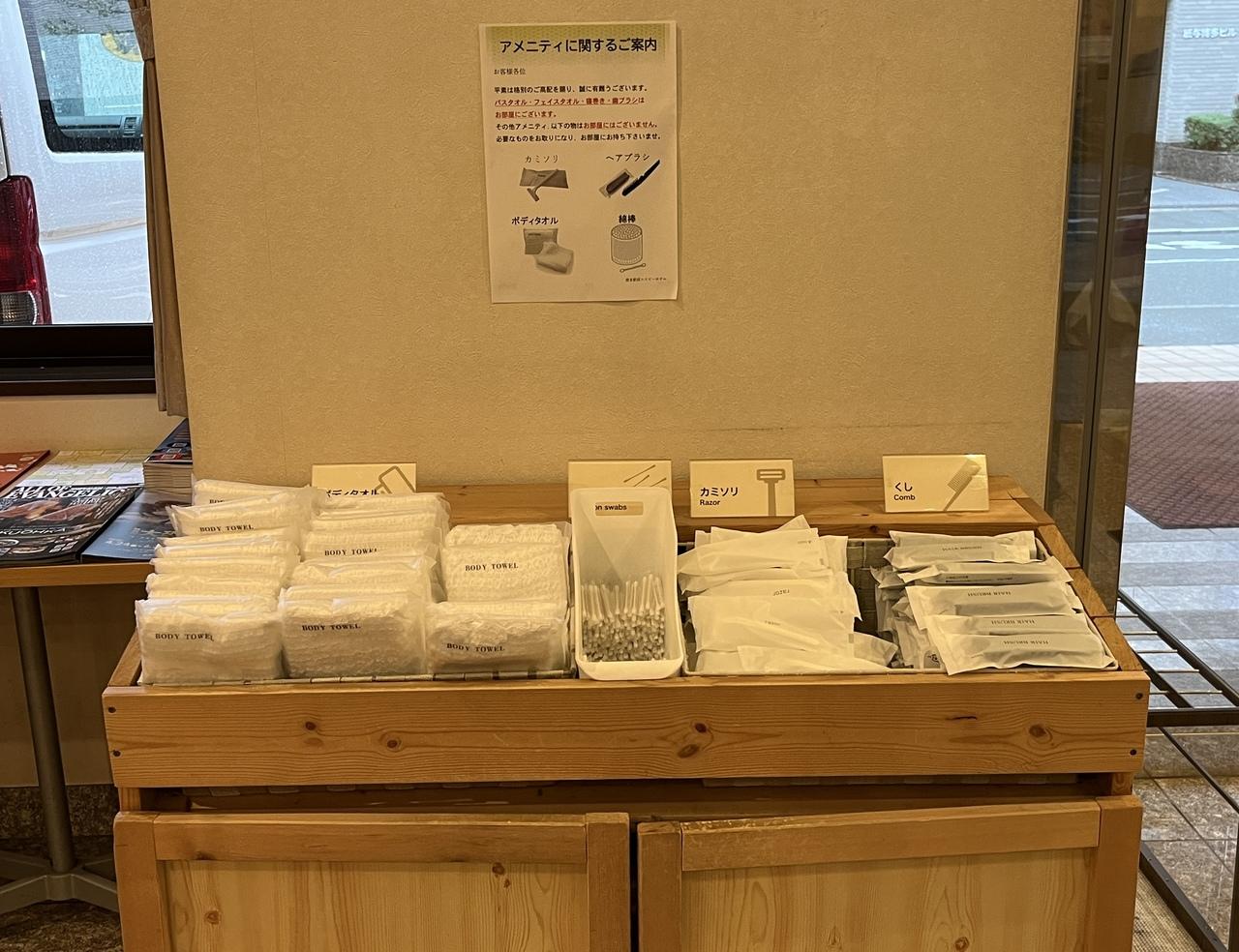 フロント向かい、入ってすぐ右にはセルフアメニティ。ボディタオル、綿棒、髭剃り、くし。