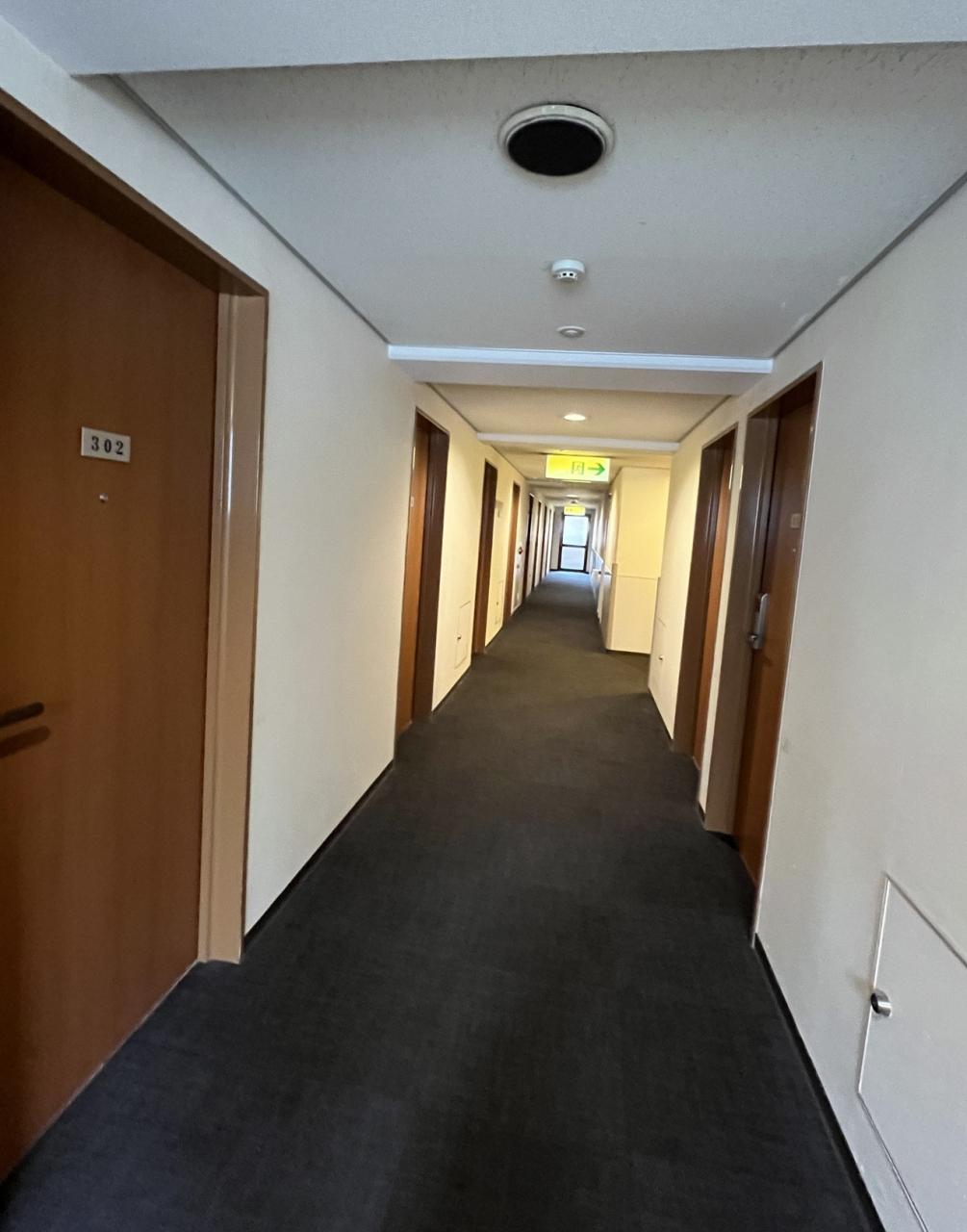 部屋から出て廊下を見ると、こんな感じ。部屋数は多くはありません。