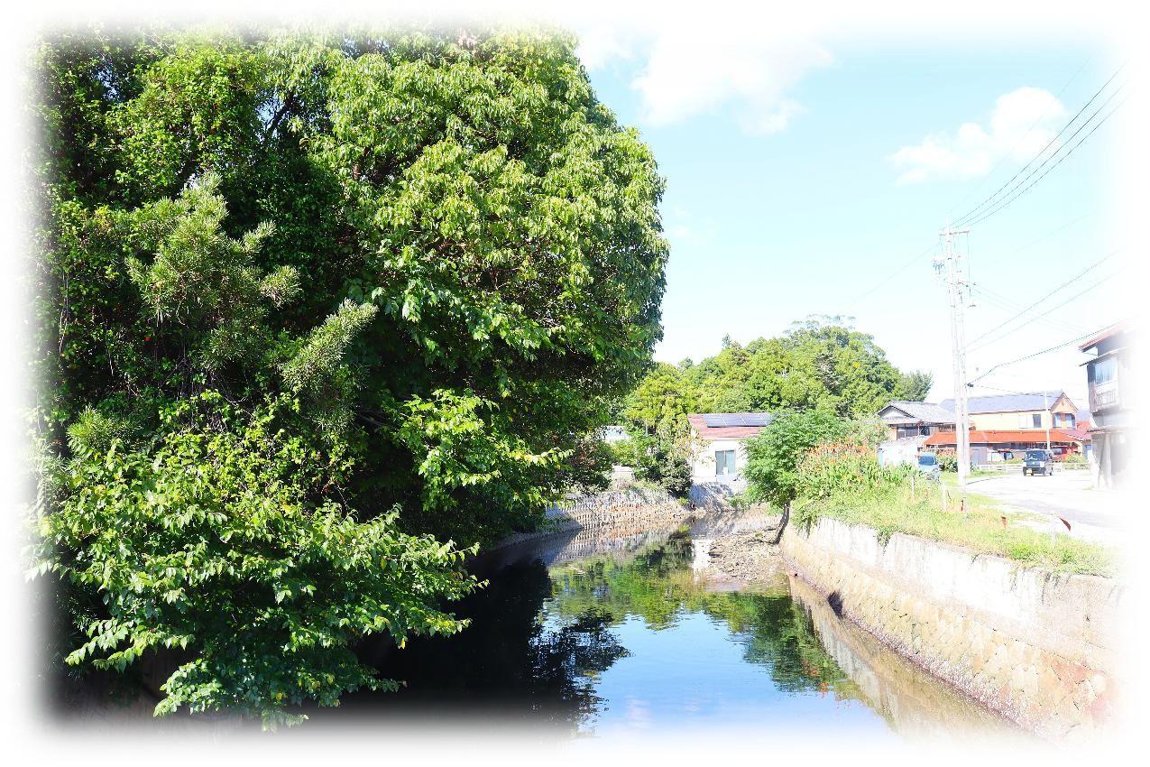 内海川右岸に鎮座する如意輪寺、すぐ右には内海川が流れており、少し先には入見神社の杜が見えています。