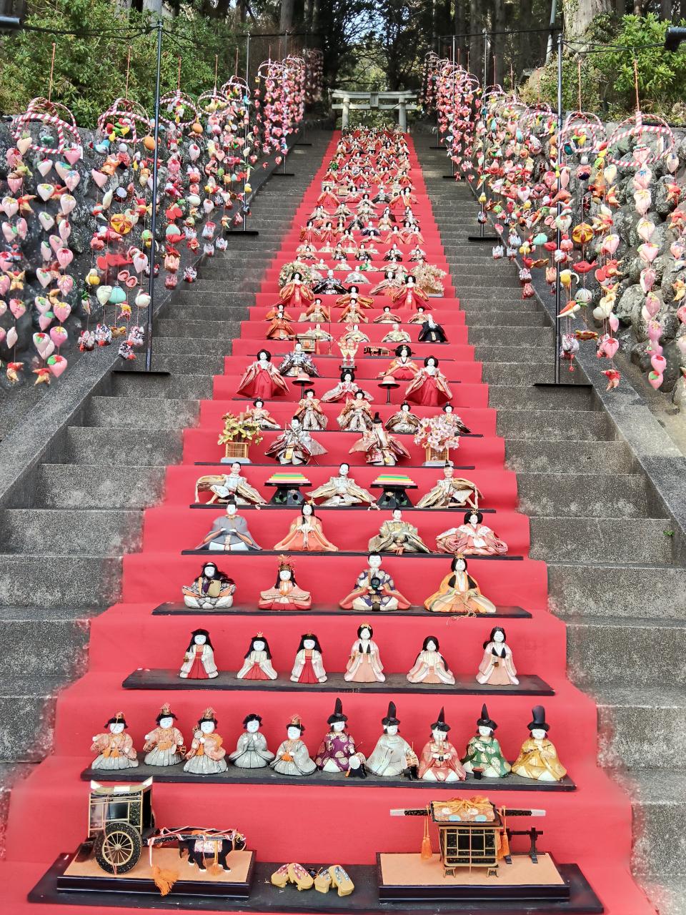 結構きつい坂道を登っていくと、階段に並べられたすごい数のお雛様