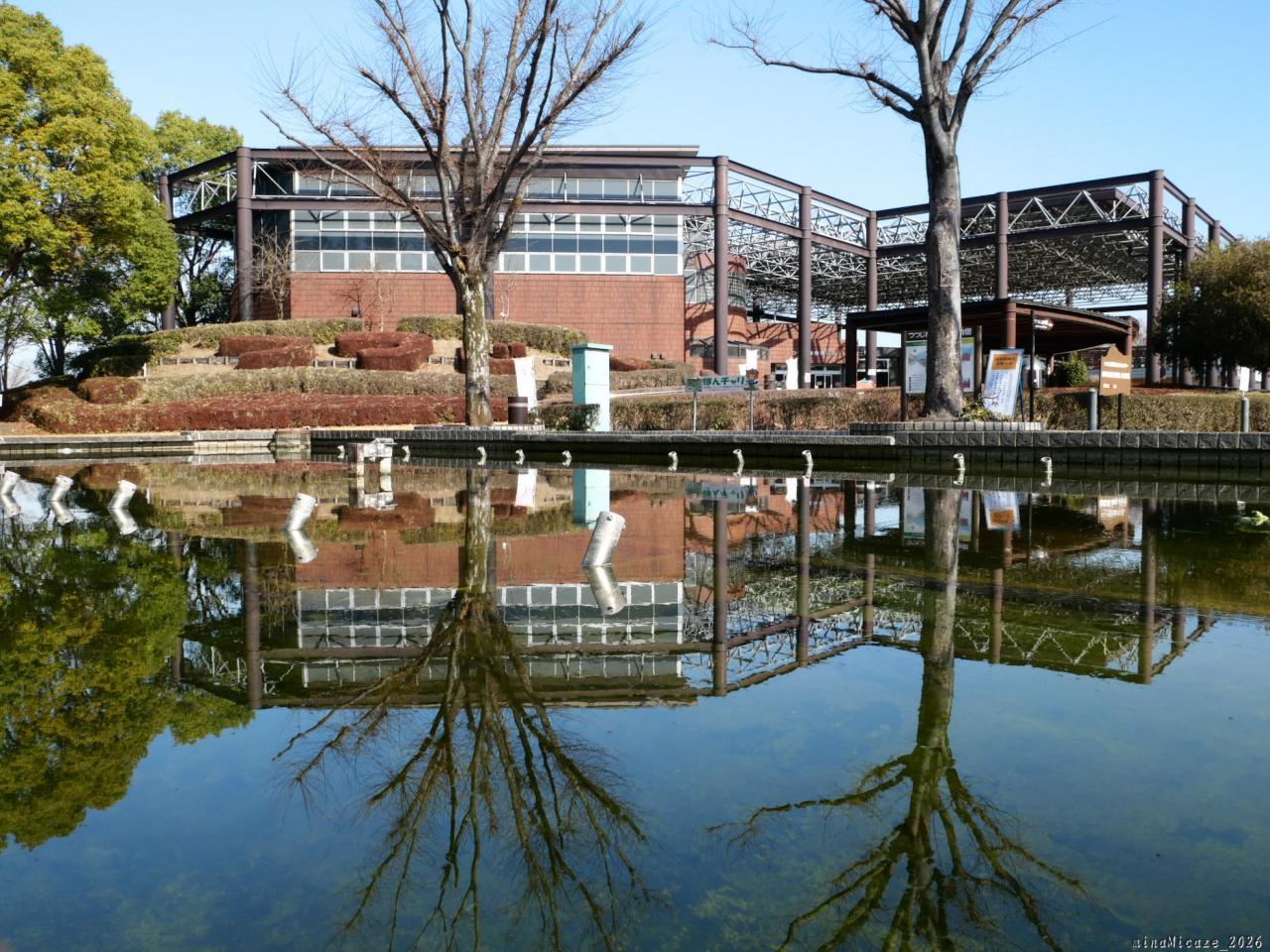 群馬県館林市「つつじが岡公園」の「つつじが岡ふれあいセンター」です。噴水が止まっているので(そして風が弱いので)、水面に綺麗に映っています。