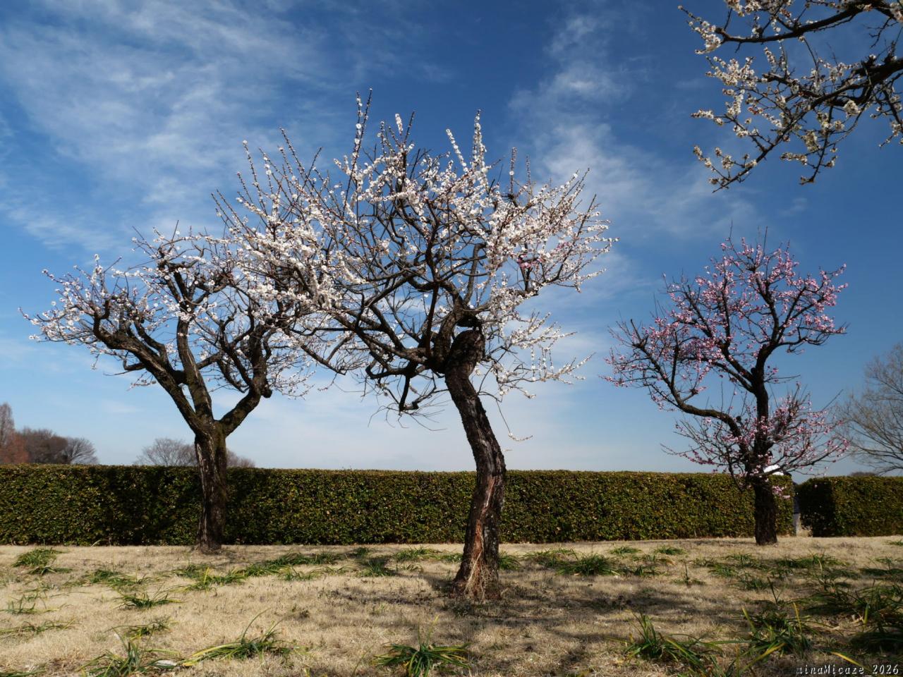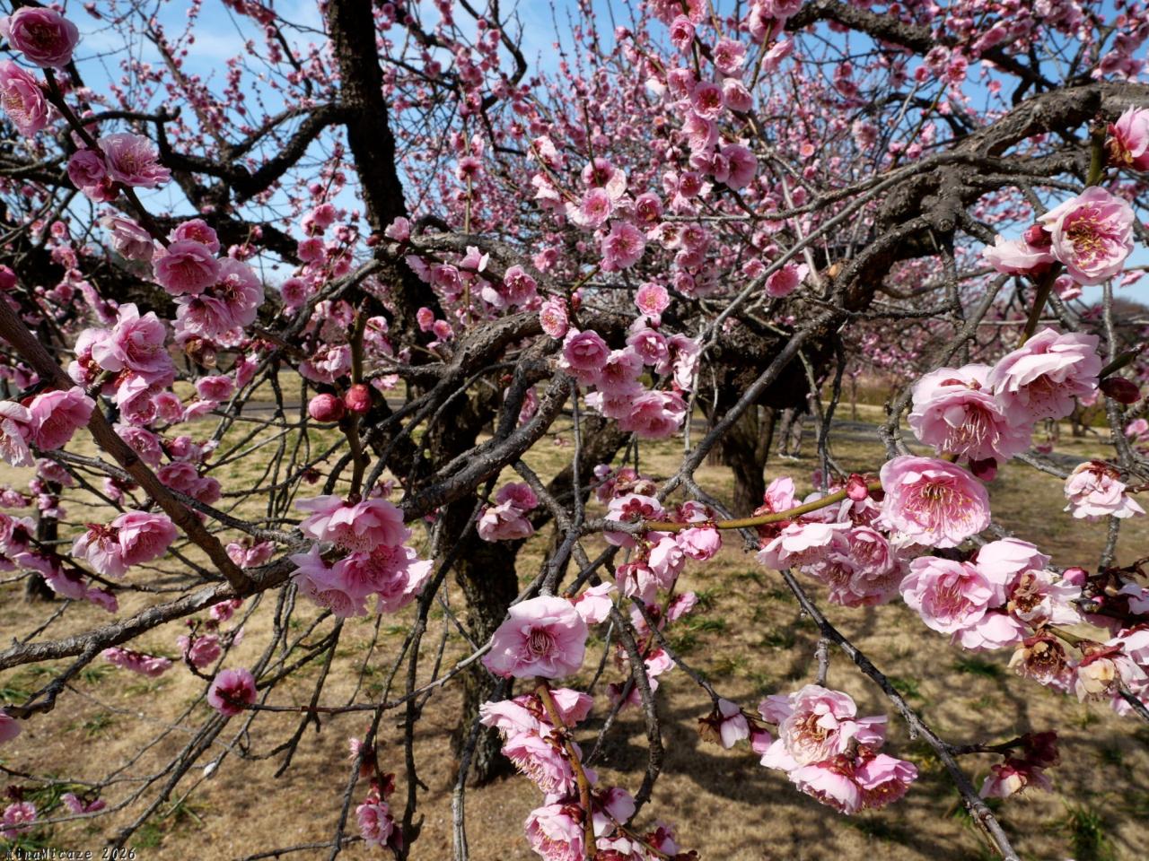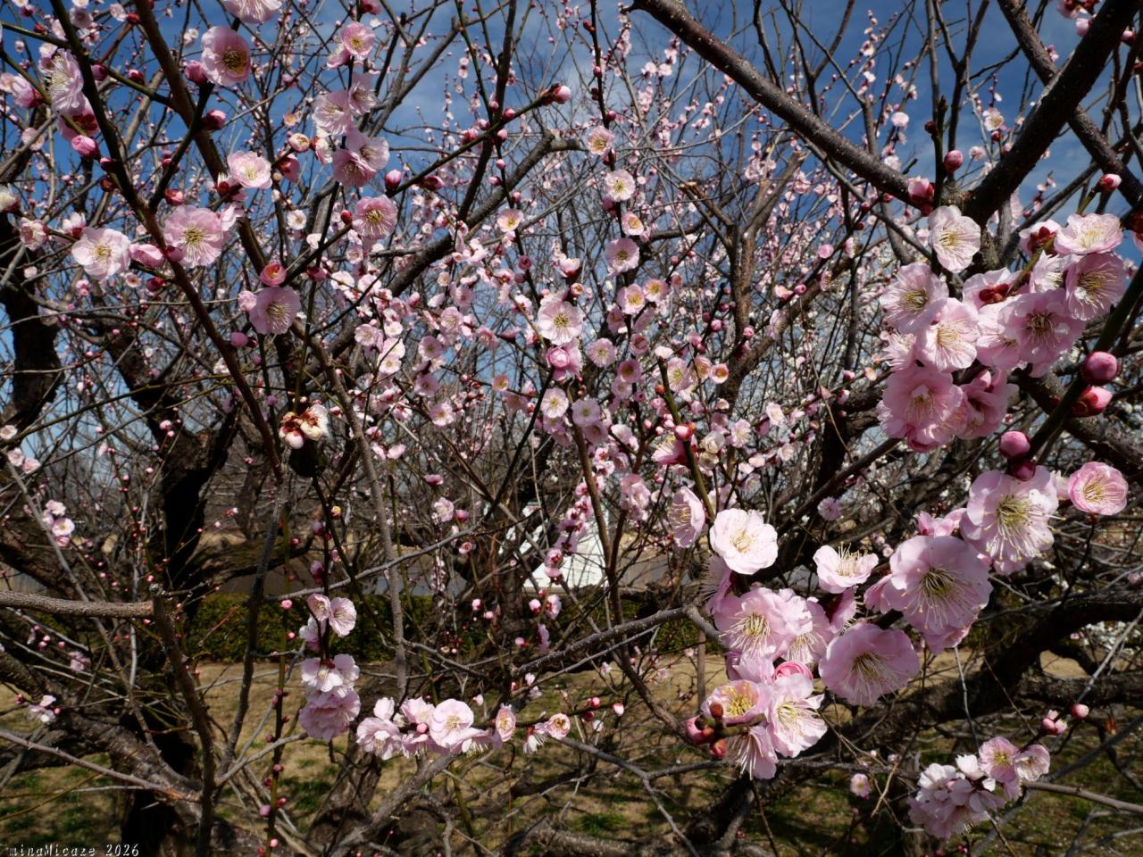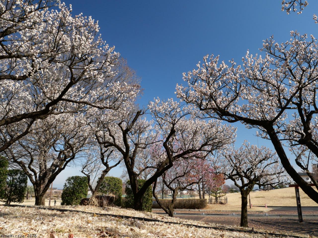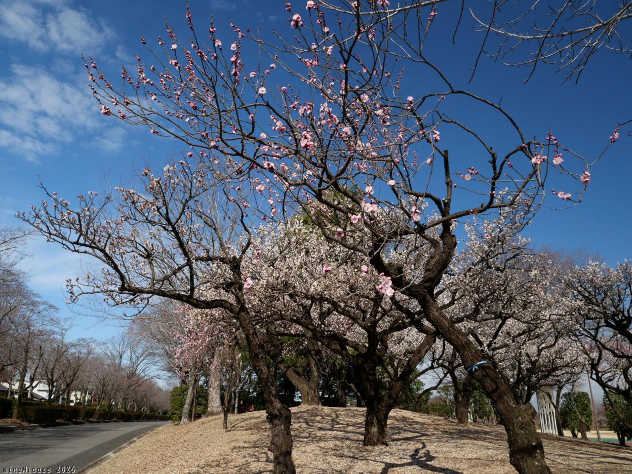群馬県館林市の「つつじが岡公園」へ、ウメを見に行きました。紅梅、白梅ともに咲き続けていて、ロウバイも未だ咲いていて、赤、白、黄色が揃って綺麗でした。早くから咲いていた花は傷み始めてますが、遅く咲いた花は未だ綺麗ですし、これから咲きそうなツボミもあるので、見頃継続中の印象でした。