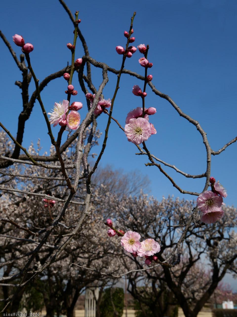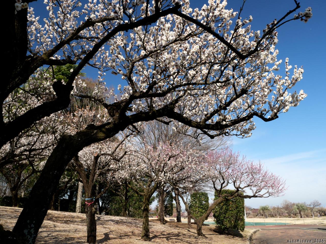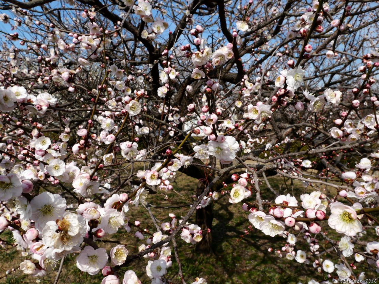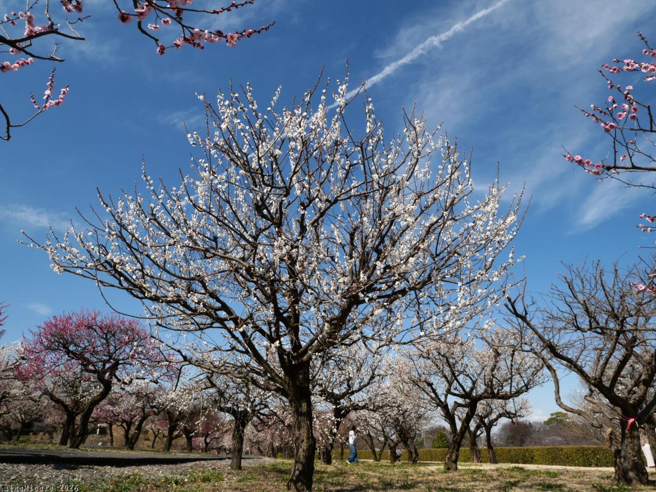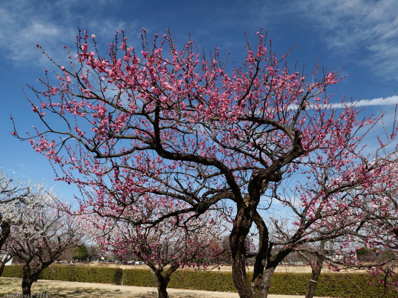 群馬県館林市の「つつじが岡公園」へ、ウメを見に行きました。紅梅、白梅ともに咲き続けていて、ロウバイも未だ咲いていて、赤、白、黄色が揃って綺麗でした。早くから咲いていた花は傷み始めてますが、遅く咲いた花は未だ綺麗ですし、これから咲きそうなツボミもあるので、見頃継続中の印象でした。