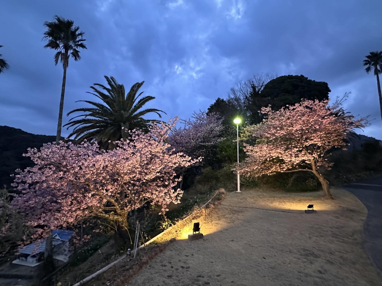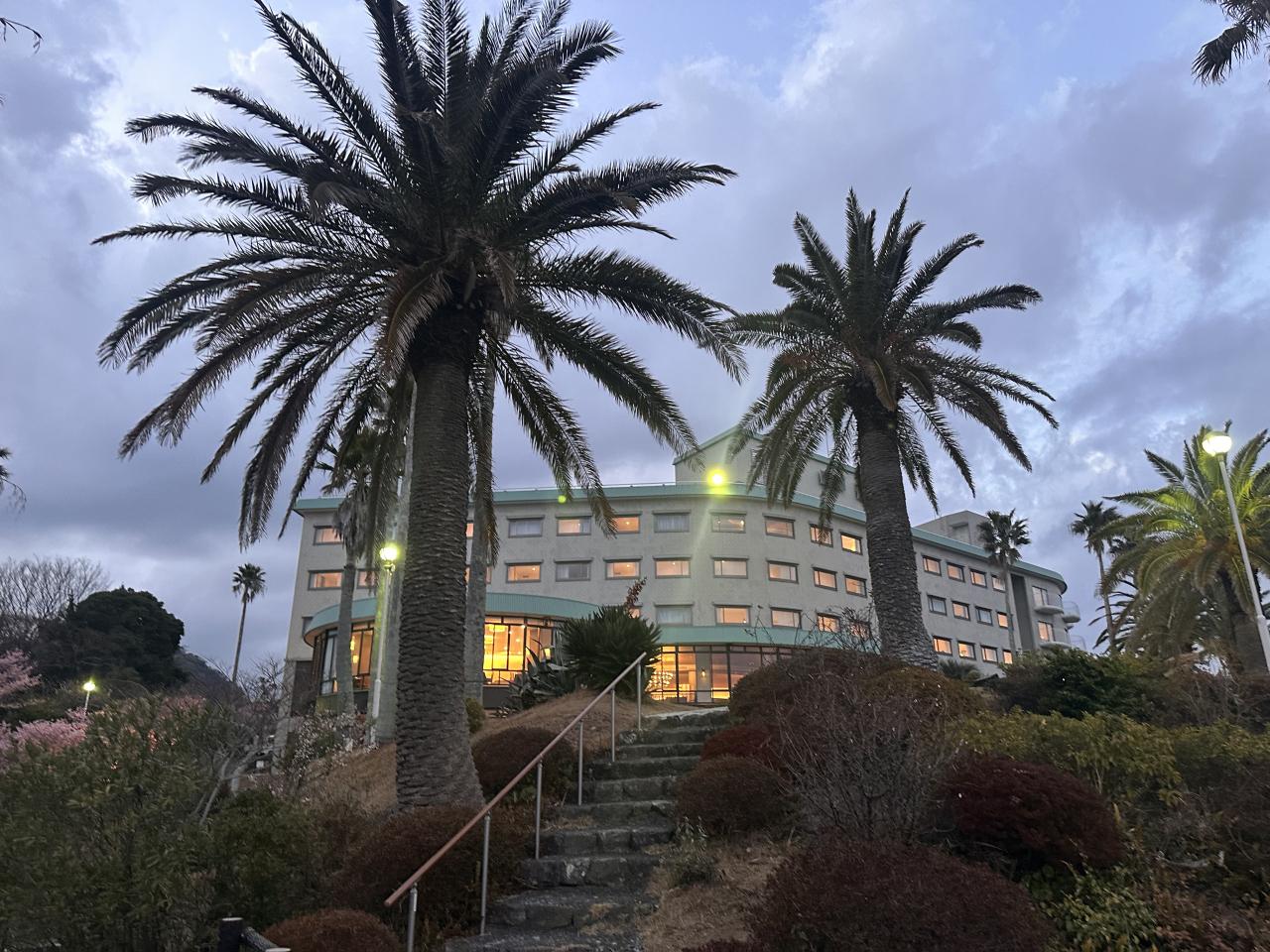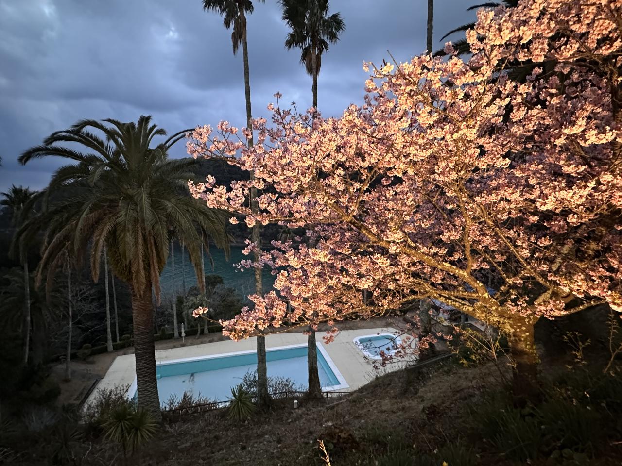ホテルの前庭にも河津桜。ライトアップされて夜桜が見られます。