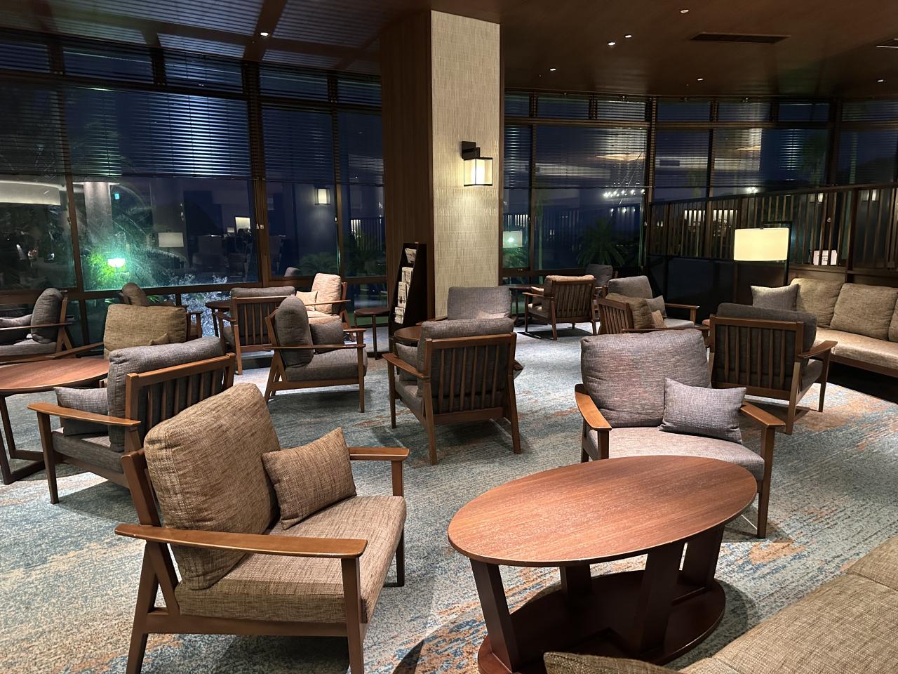 ホテルロビー。昼は喫茶スペースのようですが、朝夕は自由に使えます。