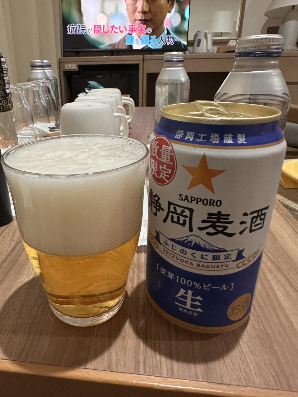 静岡ビールを頂く。部屋にはなぜか4人分の什器がありました。