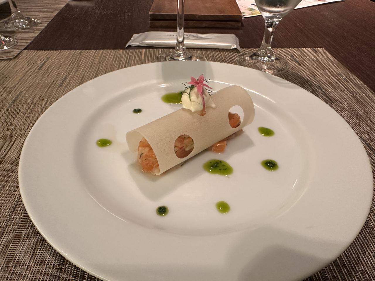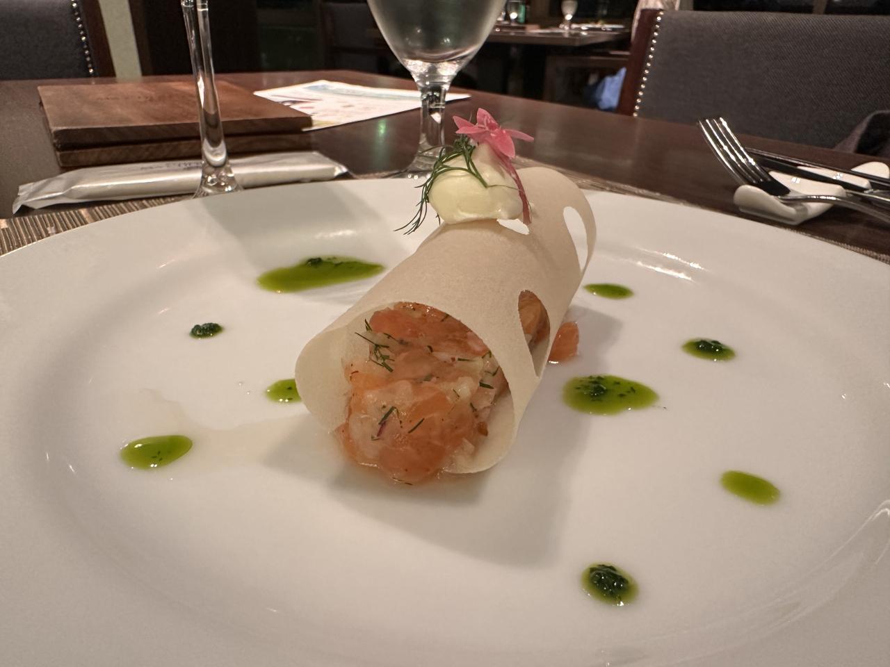 富士山サーモンのタルタル、サワークリーム添え、天城トンネルを思わせて。