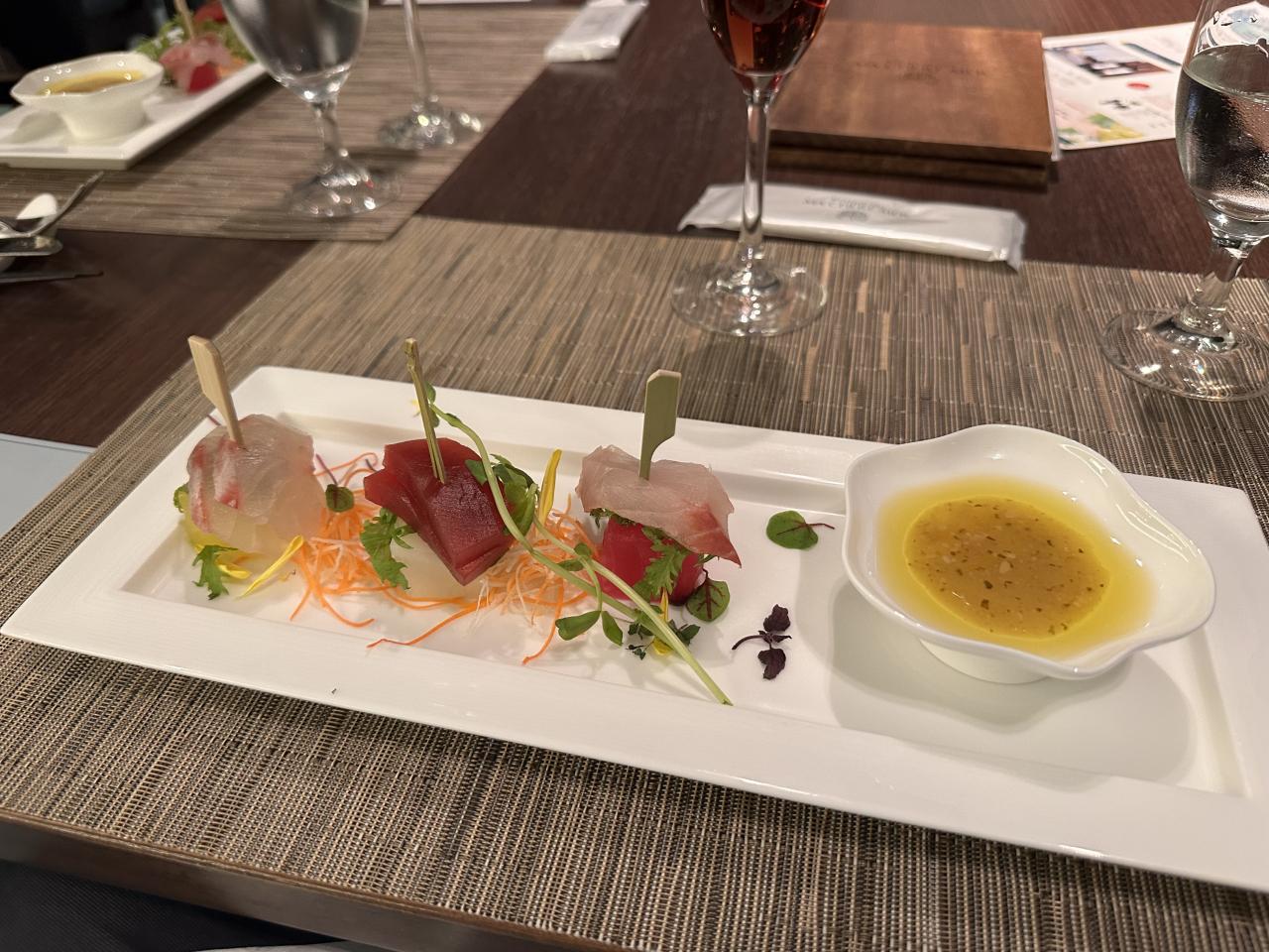 三色の大根ピクルスに載せたお刺身盛り合わせピンチョス仕立て