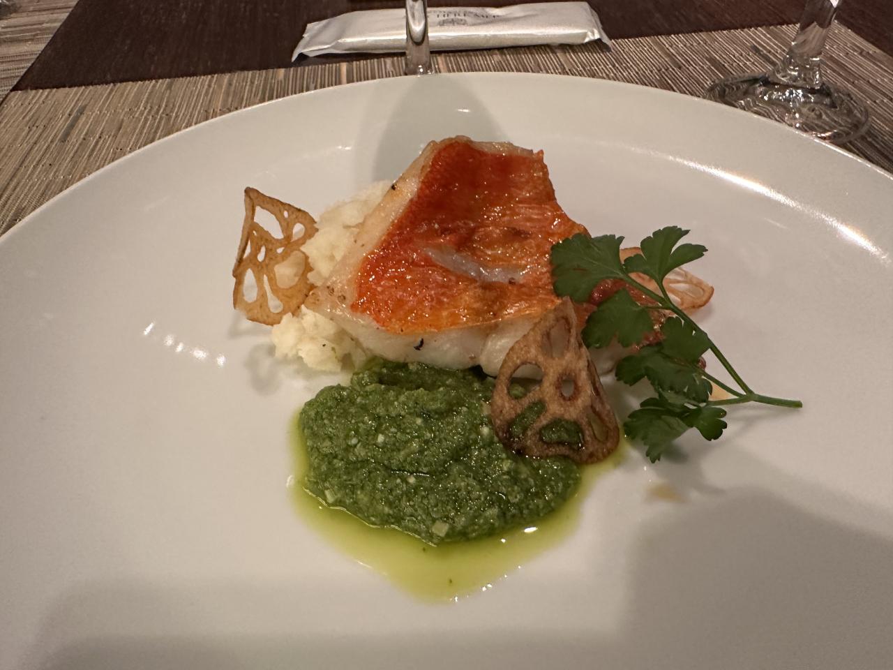 伊豆産金目鯛のロースト伊豆産青菜のジェノバソース仕立て