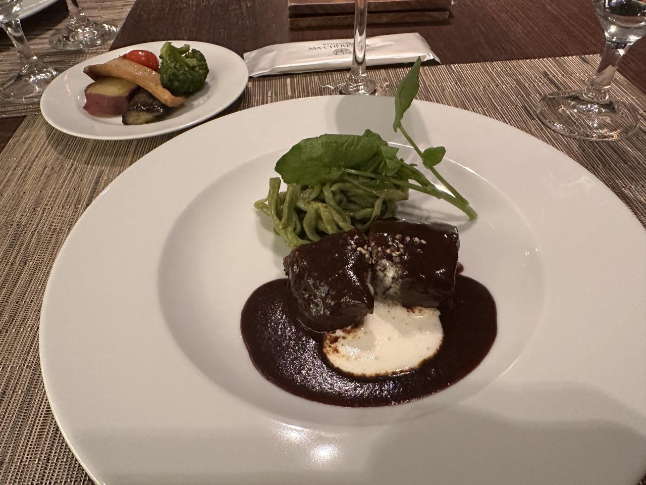 赤ワインでじっくり煮込んだ牛バラ肉と明日葉のヌイユ
