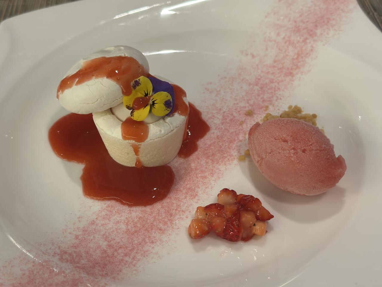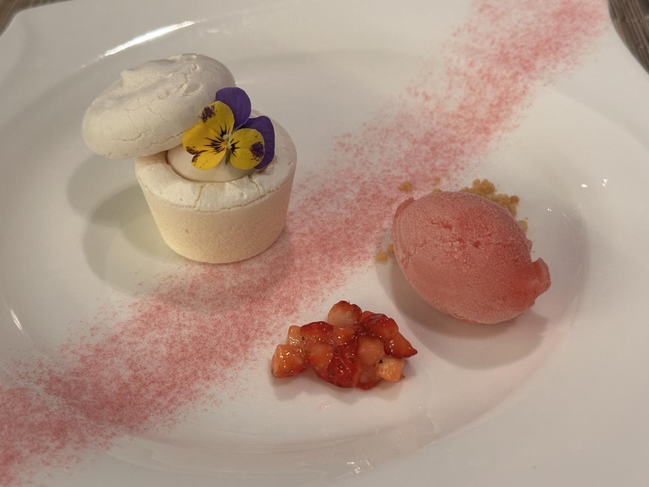 デザートはメレンゲのカップに入った苺のムース。フランボワーズのソルベとともに