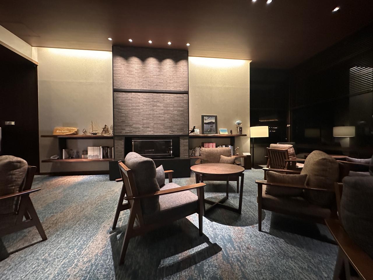 照明の落ちたロビーで新聞など。ホテルの温泉は広くは無いけど、露天風呂の眺めがよい。サウナは二人でいっぱいになりそうなドライサウナが男性用にだけありました。
