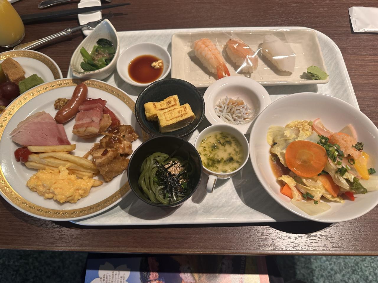 いろいろいただきました。お寿司もあってこれがなかなか美味しい。ベーコンも厚くて美味しい。