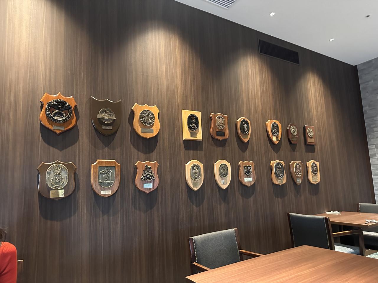 壁にかけられた盾はよく見るとアメリカの軍艦の名前が書かれています。ここを黒船祭で訪問したアメリカ海軍の軍艦から送られた物。お祭りのときは水兵さんたちが上陸して会場を楽しそうに見て回ってましたね。第七艦隊の比較的小さい船が来ているようです。