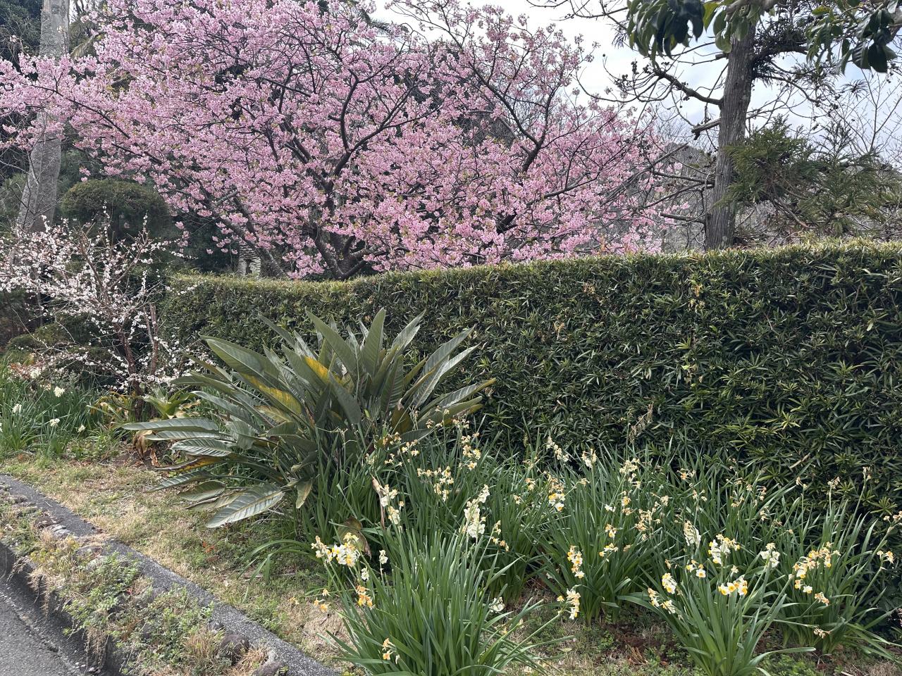 下田といえば爪木崎の水仙が春を告げるのも有名ですが、高台のせいかまだ水仙も咲き残っていました。