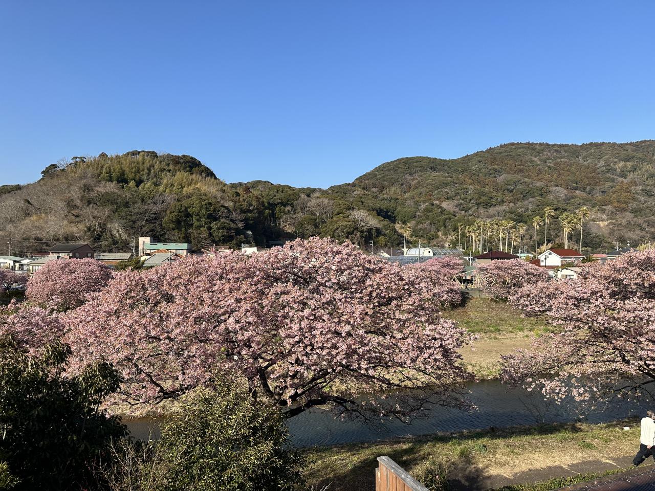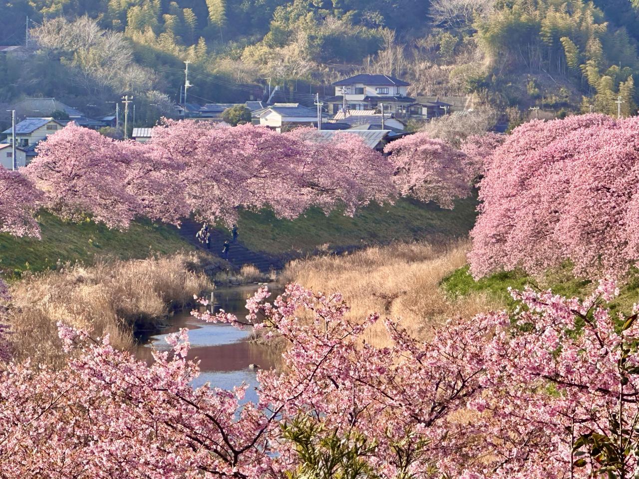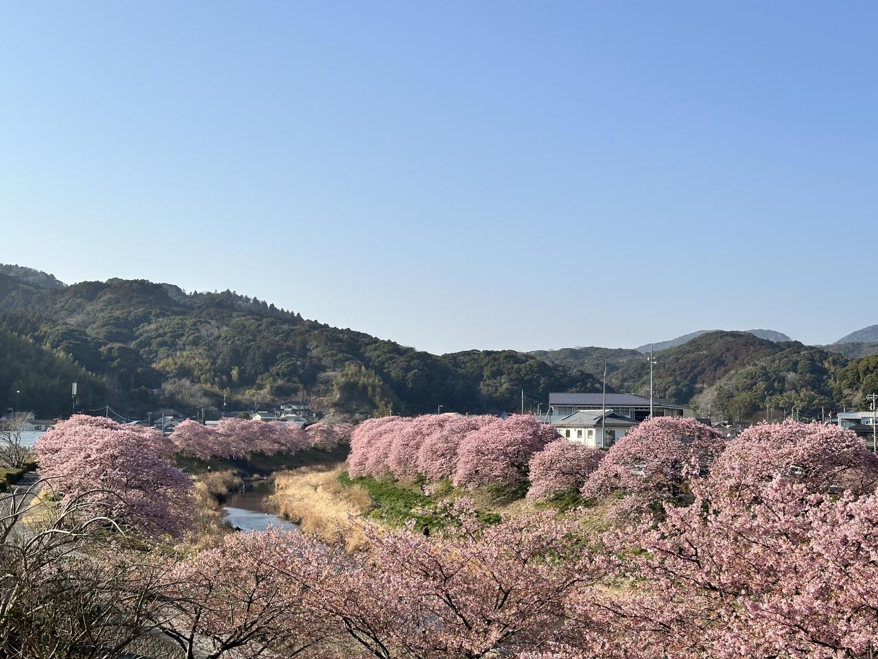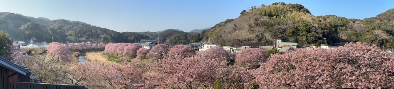 河津桜の名所と言えばなんといっても本家の河津町が人出もナンバーワンですが、それより南の南伊豆町の河津桜並木も中々見事です。実は今回初めて訪れたのですが、こちらも4km以上続く両岸の桜並木でとても見応えがあります。伊豆急行の終点下田駅からさらにバスというちょっと不便なところなので人出が河津よりはるかに少ないですから、混雑の苦手な人にはこちらがよいかも。町の温泉施設もあって、桜の眺めもすばらしい。個性的な飲食店もあるようです。