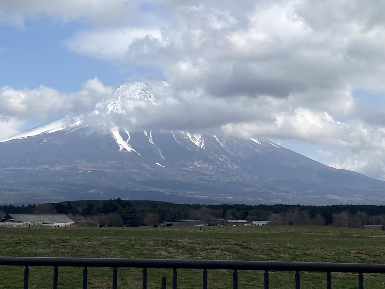 牧場が広がり、雄大な富士山。