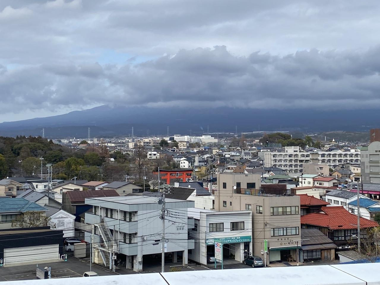北館の展望台に上がると、笠雲が富士山を覆っていました。