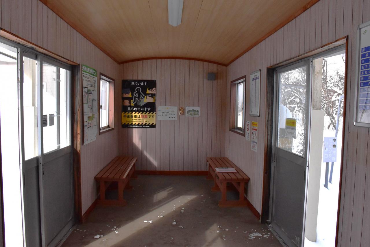 中央に出入口があり、左右に窓を設け、列車を待つ待合室に利用されています。