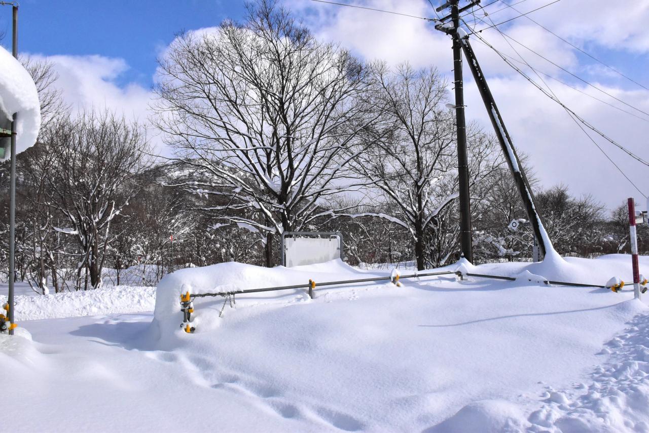 「青空が似合う雪景色の二股駅」