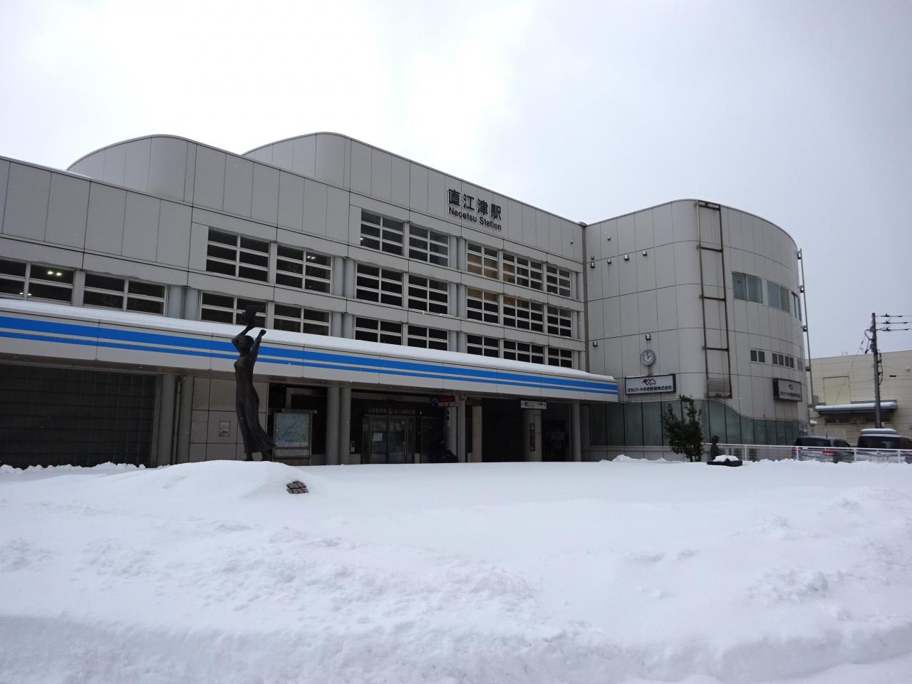 直江津駅も結構な雪でした。駅前のハイマートも雪に埋まってました。今思えば駅弁を買えばよかったな~と。ここから、今までなかなか行く機会のなかったあの場所に行ってみます。