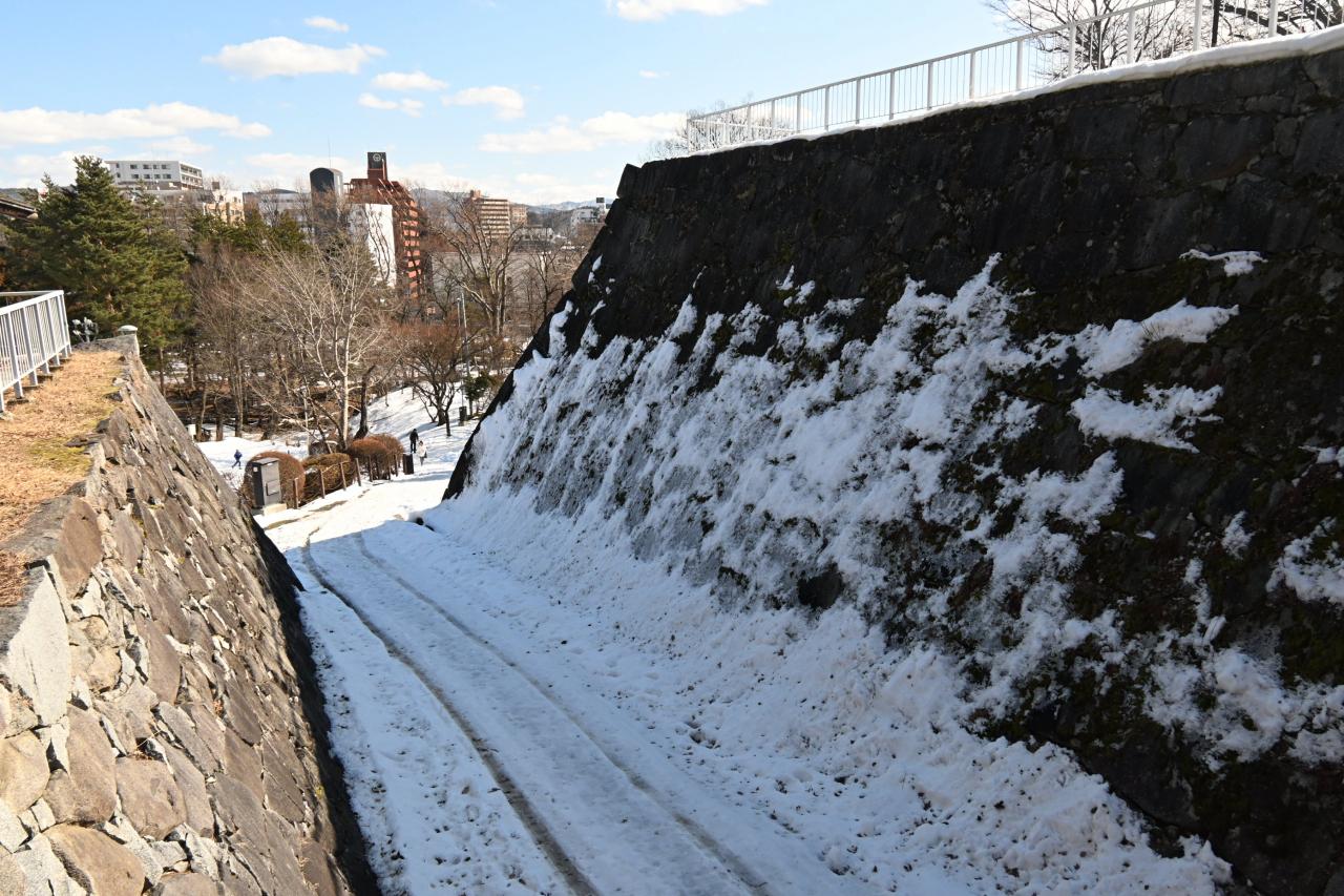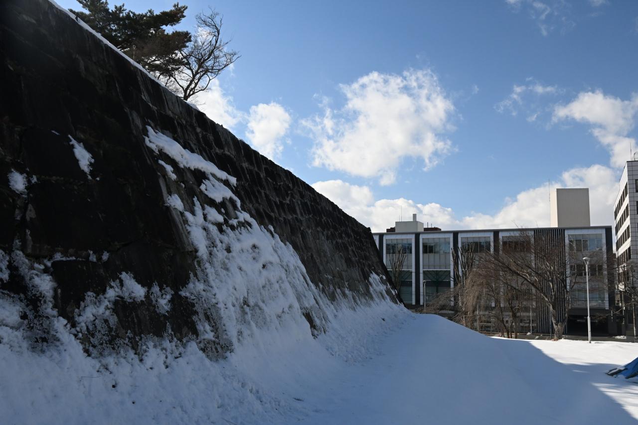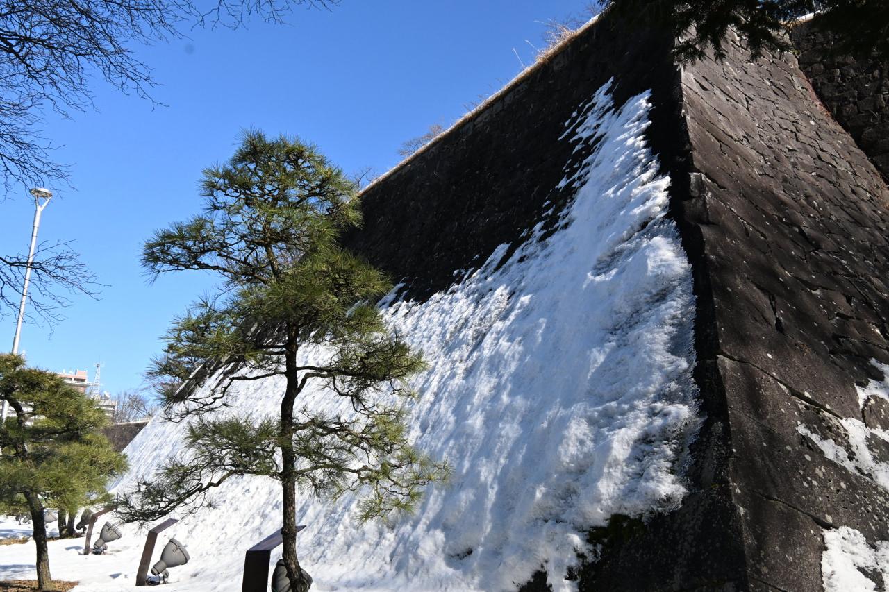 石垣に張り付いた雪がきれいです。