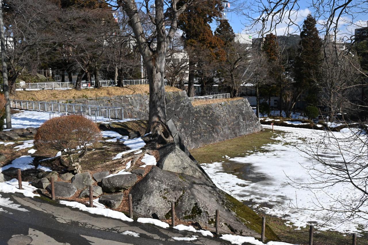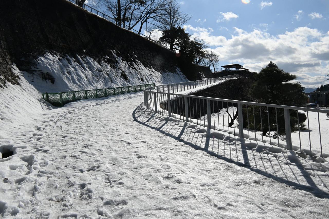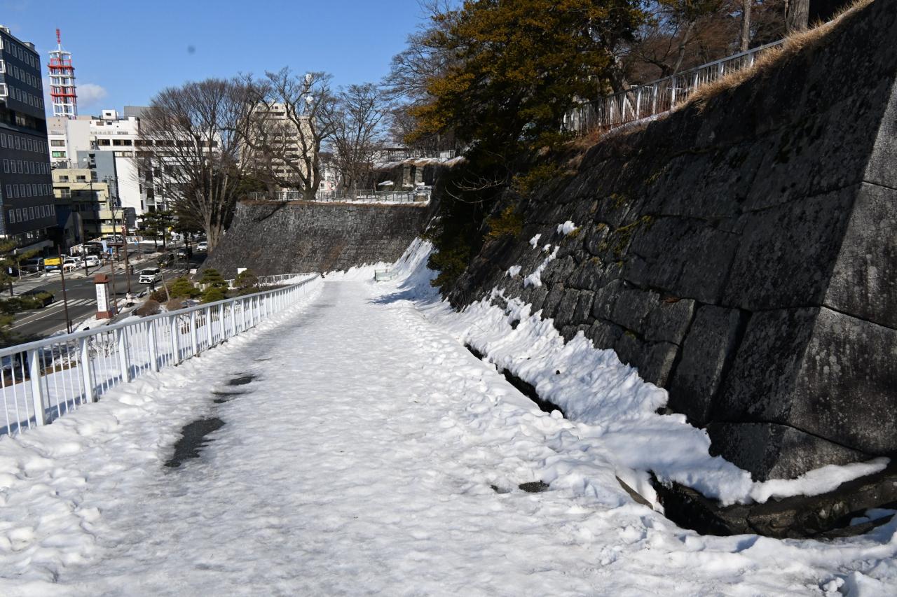 石垣に張り付いた雪がきれいです。