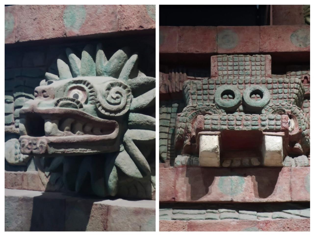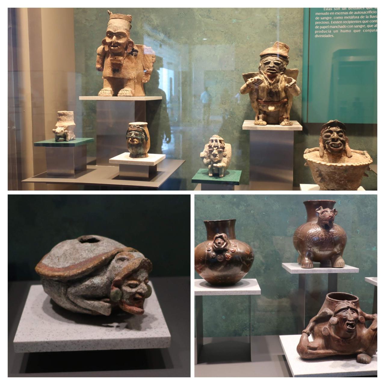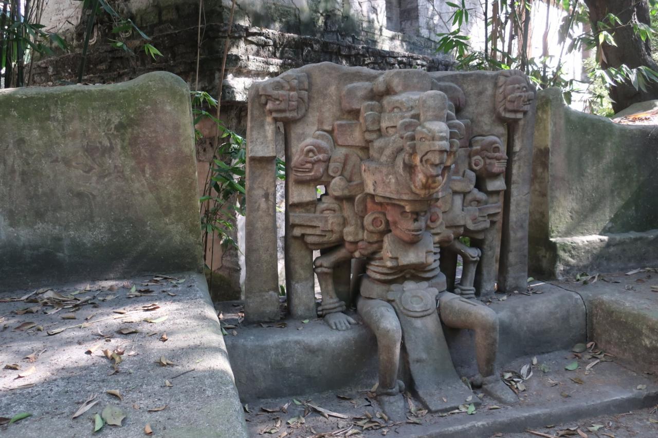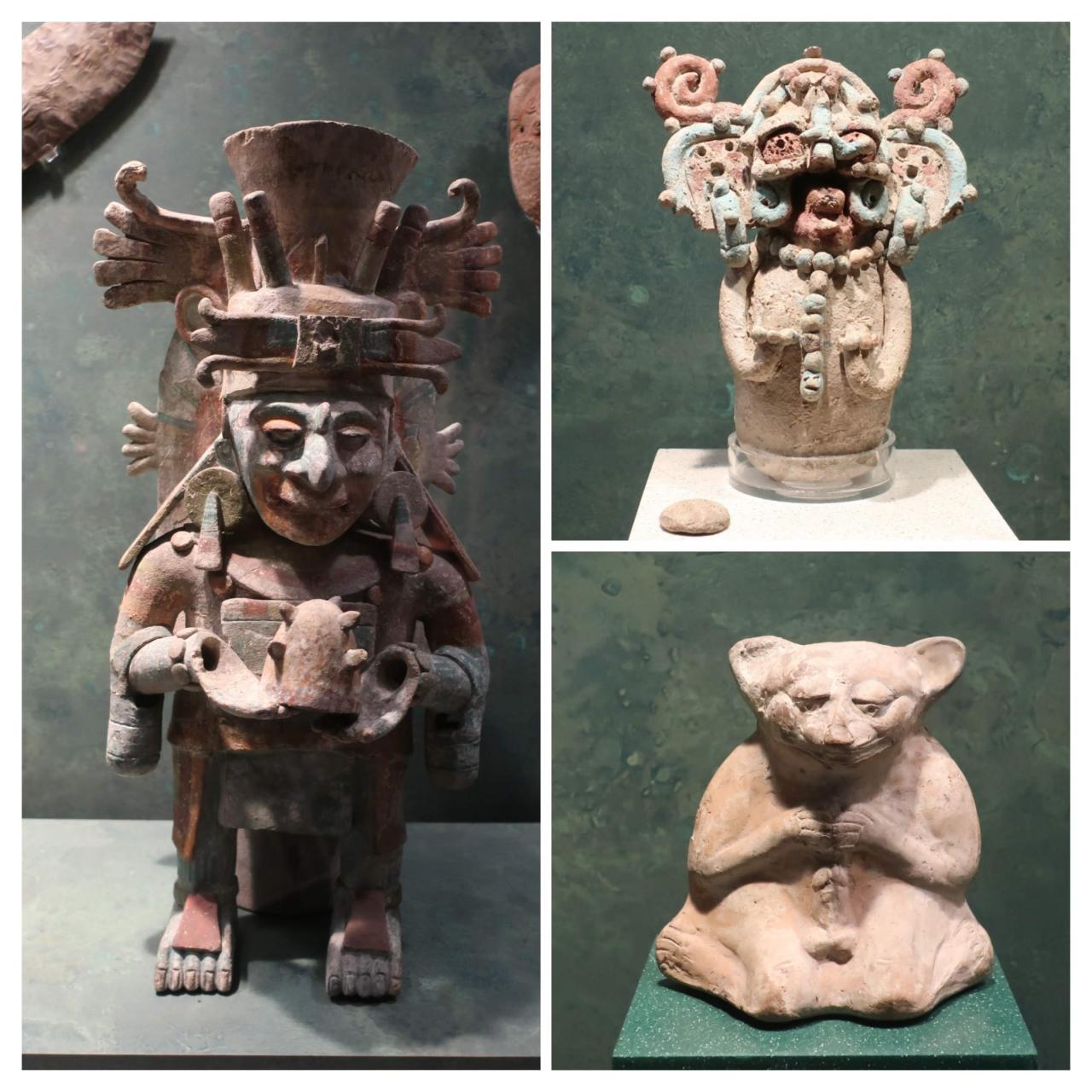 写真はエル・サポタル遺跡で見つかったミクトランテクートリ(冥府の王)の像。これはアステカ神話に出てくる神なので、アステカの影響を受けた文化であったことが分かります。頭の周りにある動物の頭のようなものは冥府の怪物だとか、死者の霊だとか言われています。それらを従えている王という構図なのでしょうが、なんだか重くて大変そうです。 -
