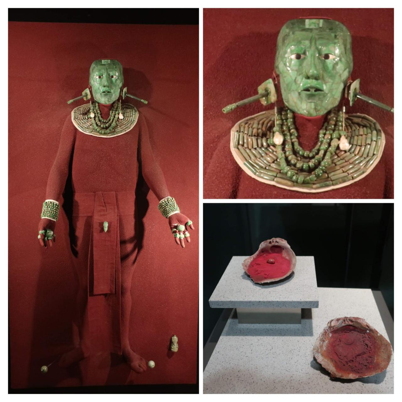 室内に戻って地下に下りて行くと、パレンケ遺跡ゾーンに入りました。有名なパカル王の翡翠の仮面が展示されていました。右下の貝に入ったものは、石棺や遺体を赤く染めるために使われた辰砂です。