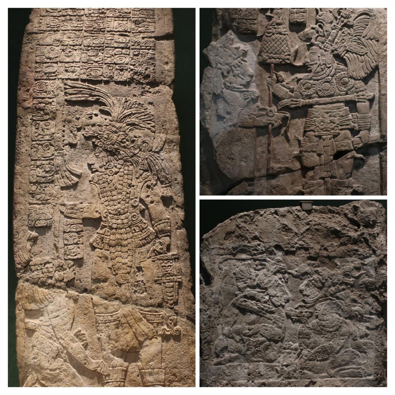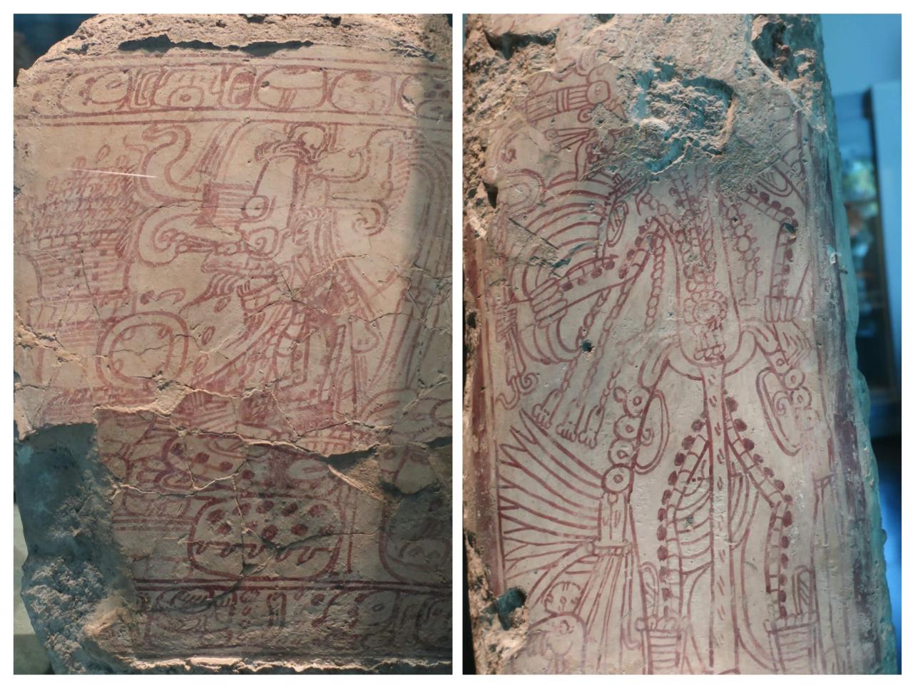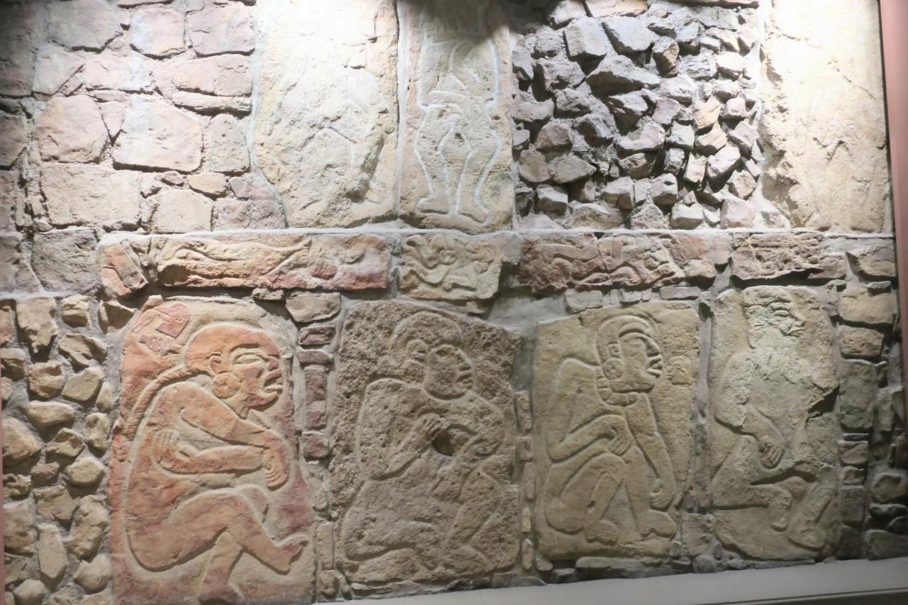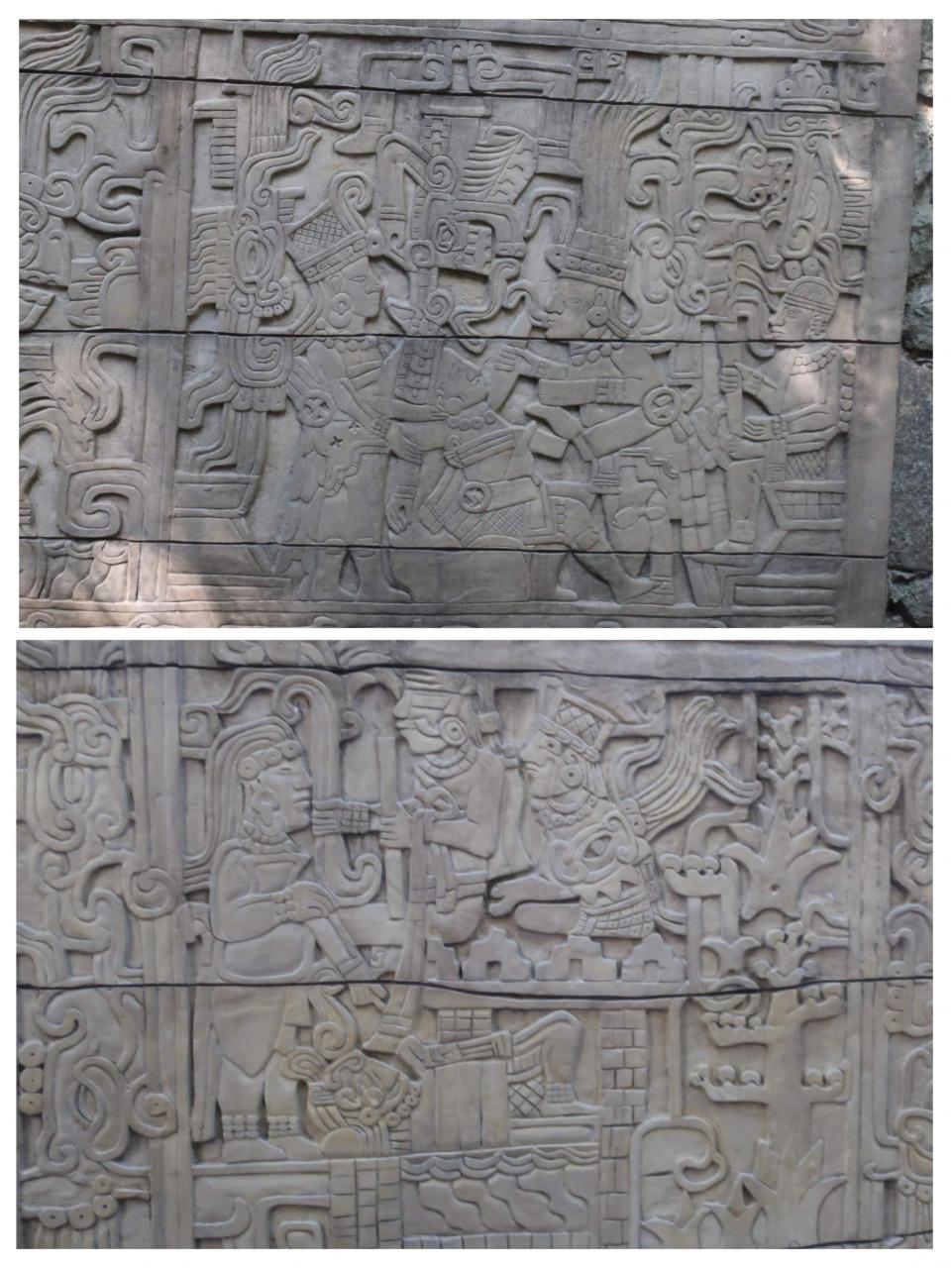上の写真は、神に捧げるために、神官たちが選手の首を切り落とそうとしているところ。下は、3人の人物の下に首や体がねじ曲がって、横たわる人物が見えます。球戯場で行われる儀式をモチーフにしたものなのですね。
