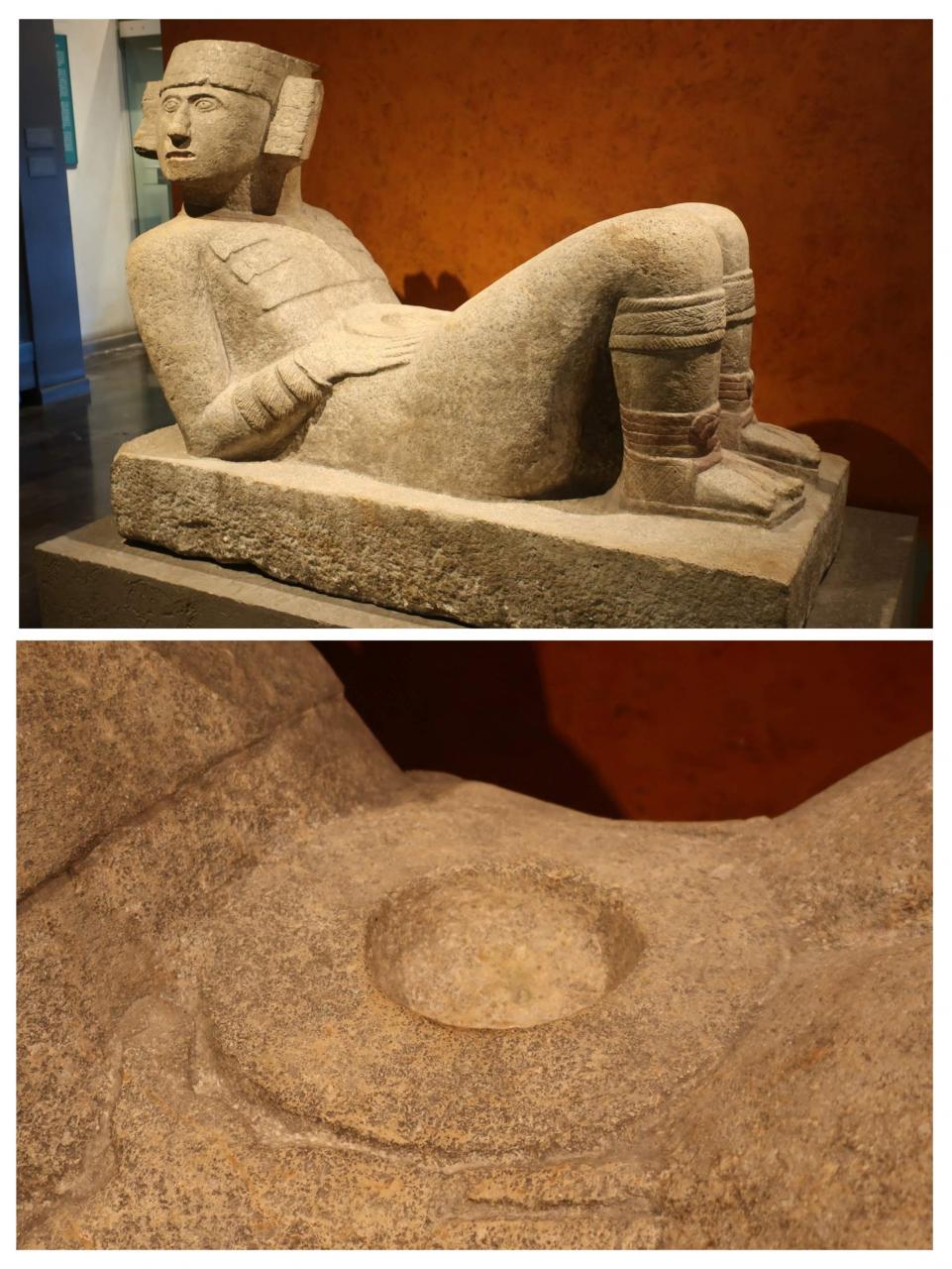 お! チチェンイツァ遺跡の戦士の神殿に置かれていたチャックモール像です。現場ではすっごく遠くからしか見えなくて、カメラのズームで漸く見えたヤツです。しかも、こちらが本物! 生贄の心臓を捧げたおなかの穴もこんなに近くで見られるなんて感激です。 -