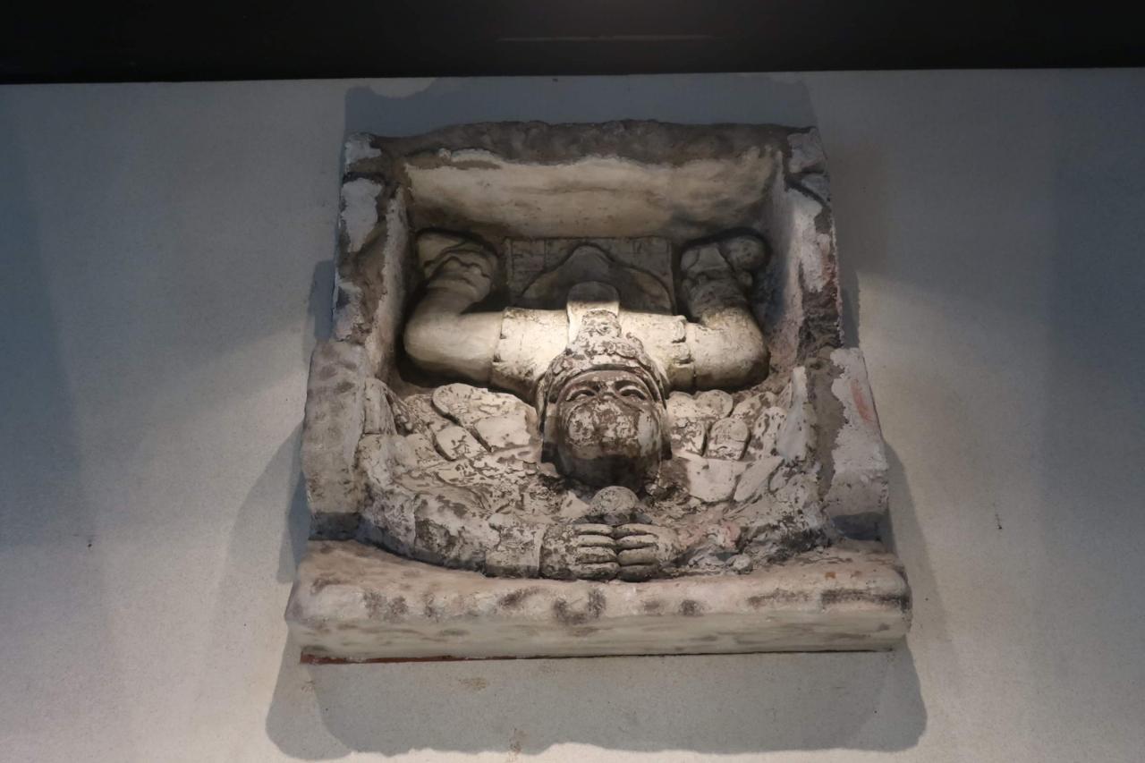 わ! トゥルム遺跡で見た降臨する神の神殿の彫刻ですね。これも現場ではすっごく遠くから、カメラのズームでしか見られなかったものです。本物はこちらにあるのですね。近くで見れて嬉しいです。遺跡を見てから博物館に来ると、あそこに飾ってあったんだなとすぐに分かるのがまた楽しいです。