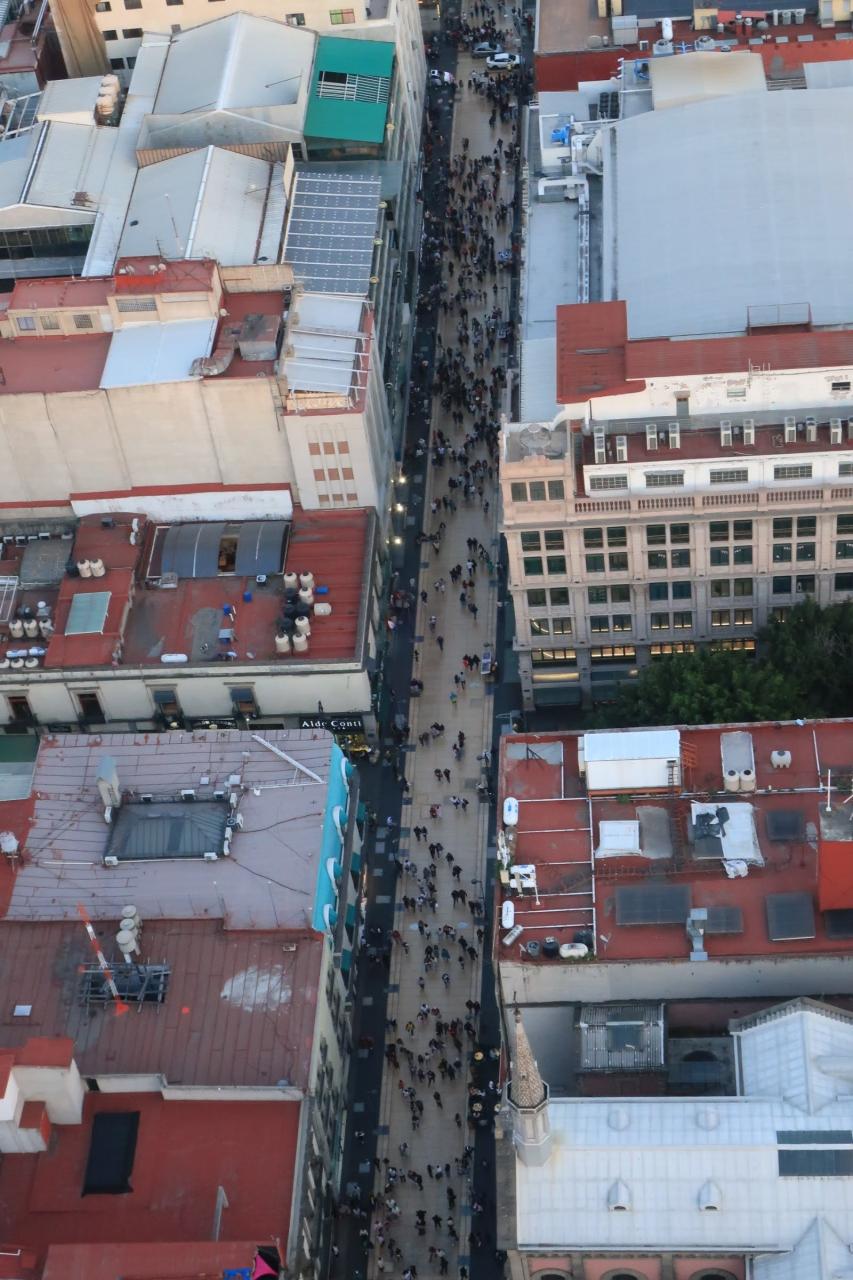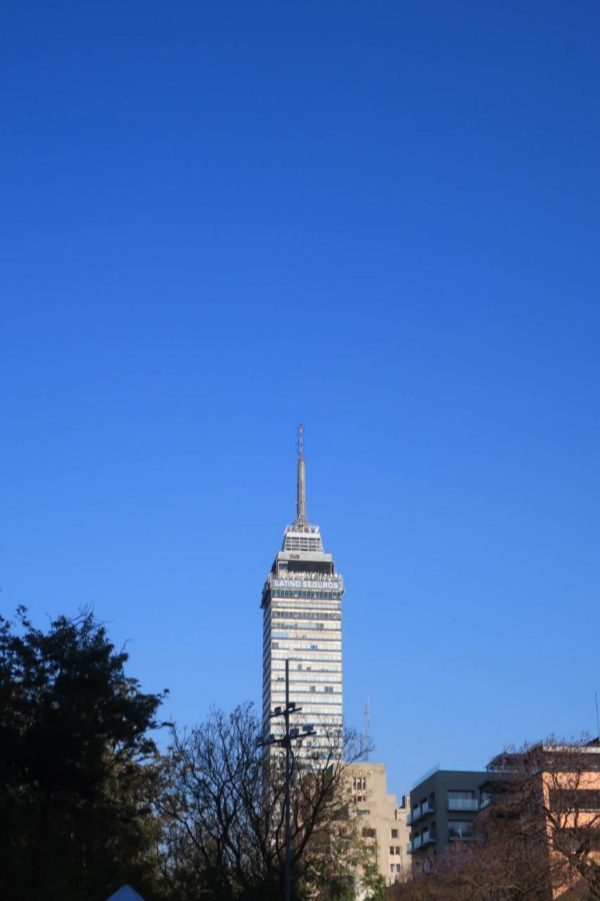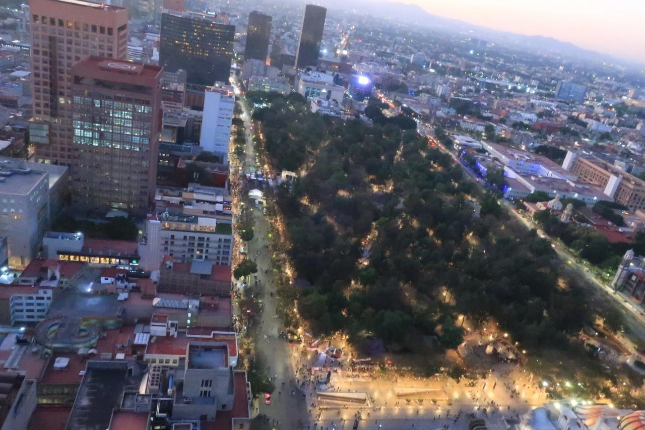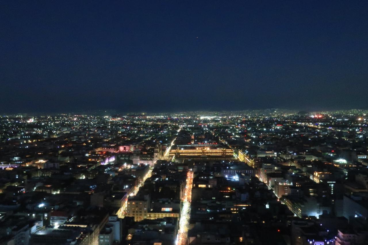 エレベーターに2回乗って、階段を少し上って屋上へ。屋上には安全のため金網フェンスがありますが、隙間から景色を見たり、写真を撮ったりできるようになっています。そして、メキシコシティで一番高い建物なので、眺めは最高です!