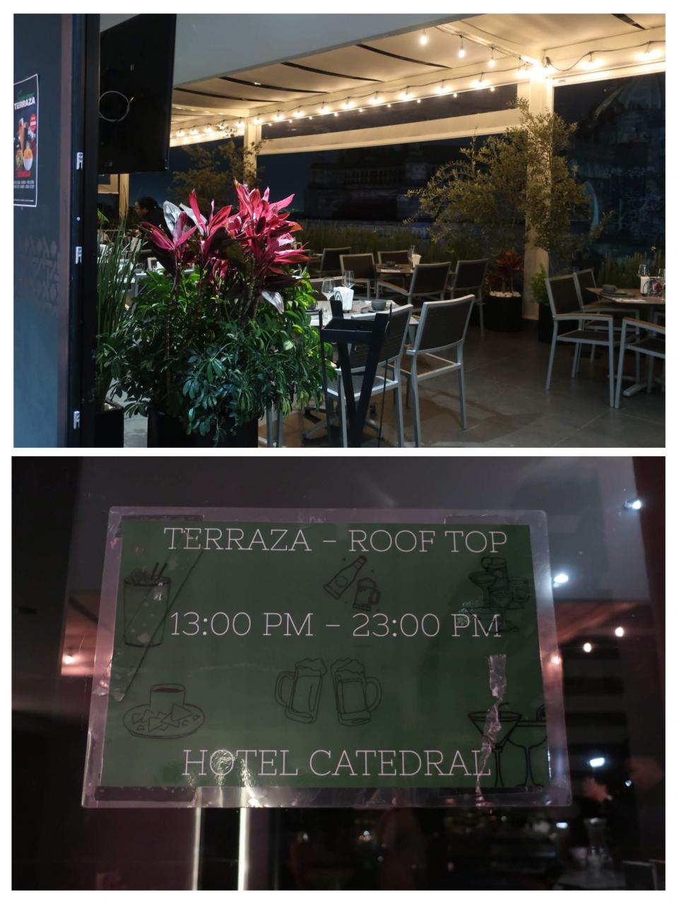 ルーフトップテラスは新館の方にあり、13:00~23:00はバー営業をしているのでバー利用で入ることができます。朝から13:00まではバー営業時間外ですが、宿泊客ならば自由に入っていいみたいです。案内してくれたスタッフが「バーを利用しなくても、写真くらい撮っていいわよ」と言ってくれた(このホテルのスタッフ、本当に親切なの)ので、少しだけお邪魔することに…。ホテル カテドラル ホテル