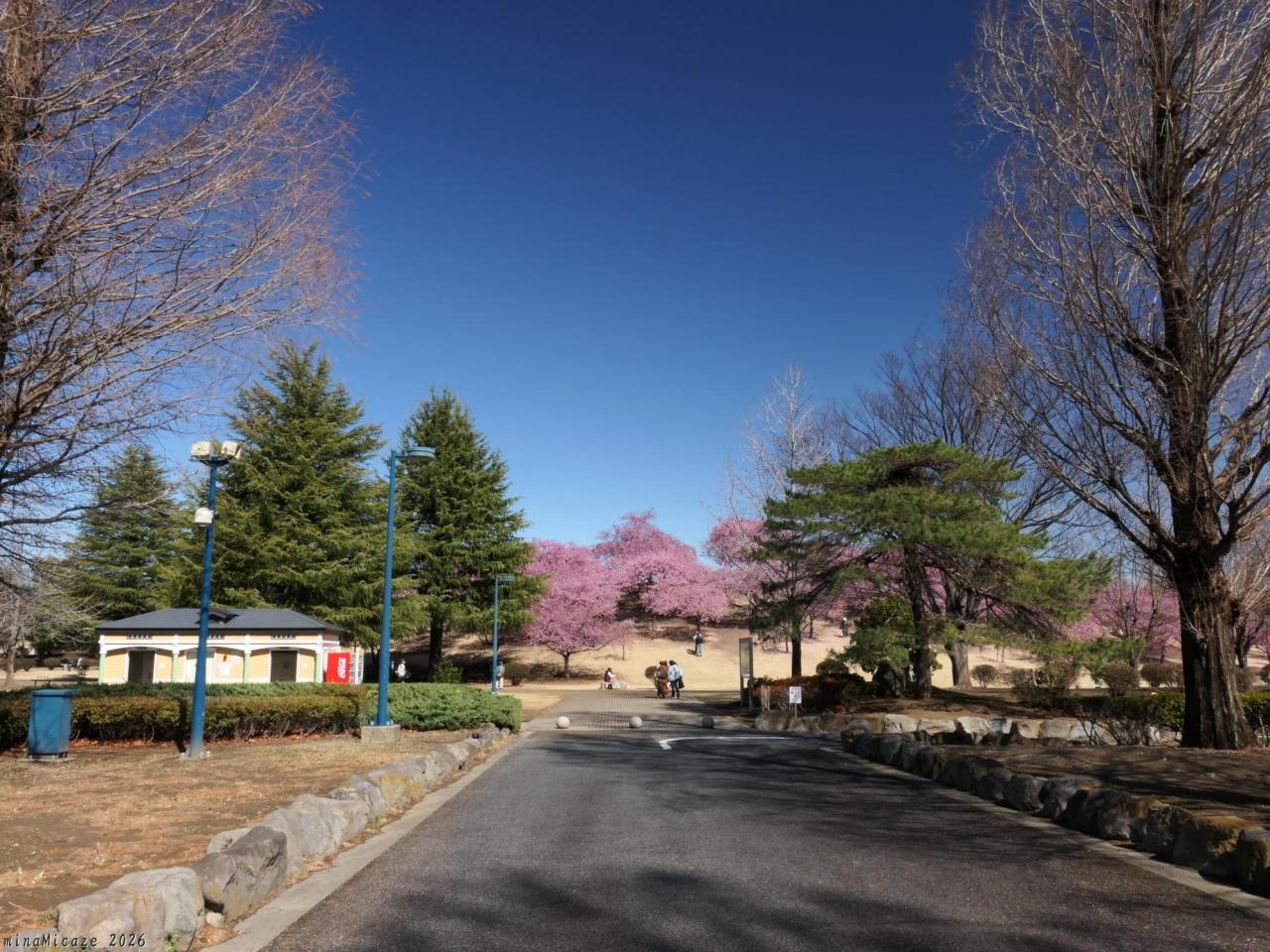 写真は南側の出入口です。中央奥に、河津桜が咲く「くさぶえの丘」が見えます。 -