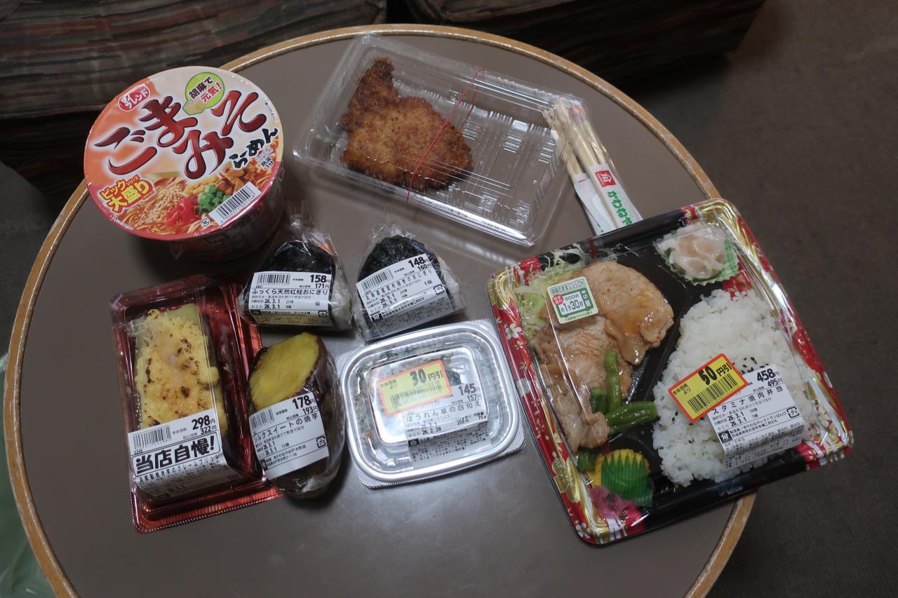 スーパーで購入した食材を広げて夕飯にします。茨城県らしく、サツマイモの焼き芋や焼き芋のクレームブリュレが安くて美味でした。